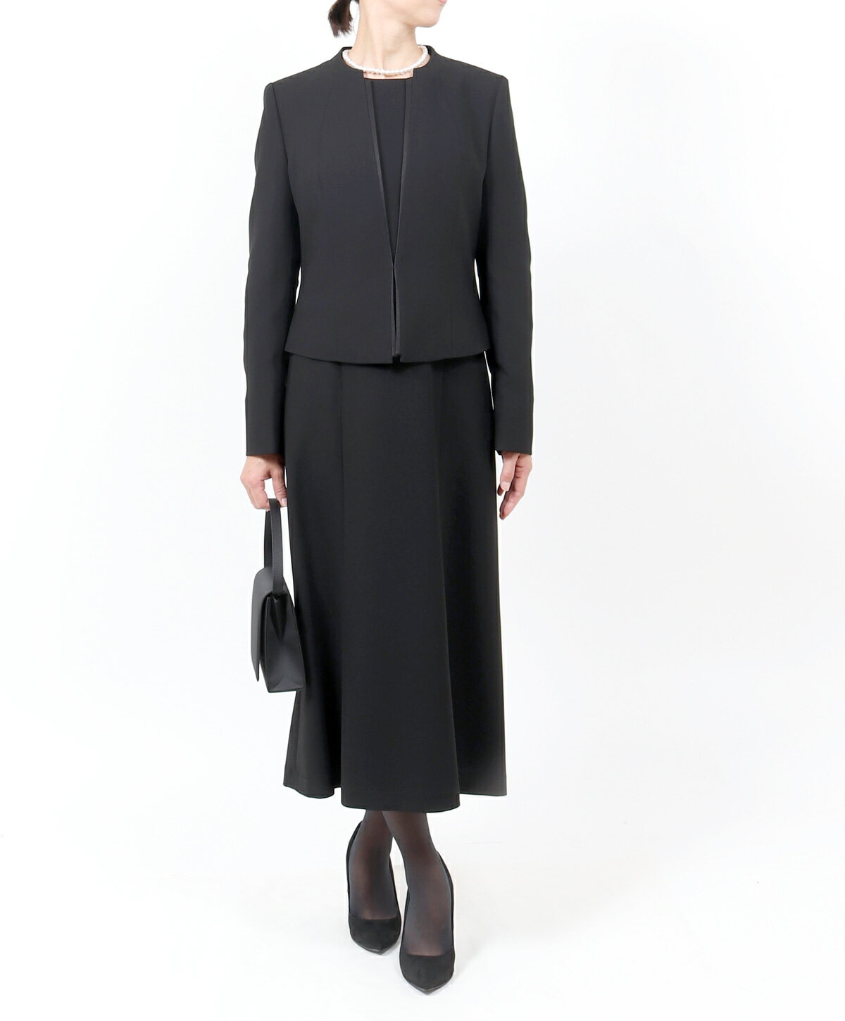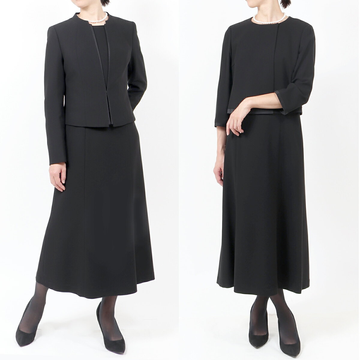 【前開き ブラックフォーマル 7号〜19号】 背の高い方にジャストサイズのロング丈のオールシーズン用ブラックフォーマルです。冠婚葬祭のマナーに沿った上品なデザインで葬式・通夜・告別式など喪の席はもちろん七五三、お宮参り、卒業式などのママスーツとしてもご使用いただけます。また、ワンピースは人気の前開きファスナーで脱ぎ着が楽ちんで授乳にも対応出来ます。 ■セット内容ジャケット・ワンピース■サイズ展開 [7号][9号][11号][13号][15号][17号][19号] ■実寸サイズジャケット 7号 9号 11号 13号 15号 17号 19号 B 92 95 98 102 106 110 114 肩幅 38.5 39 40 40.5 41 42 43 袖丈 62 62 62 62 62 62 62 着丈 47.5 48 48 48 48 49 50.5 ワンピース 7号 9号 11号 13号 15号 17号 19号 B 88 92 96 100 104 108 112 W 78 82 86 90 94 98 104 H 96 100 104 108 112 116 120 肩幅 38 38.5 39 39.5 40 41 42 袖丈 43 43 44 44 45 45 46 着丈 117 117 117 118 118 119 120 サイズがご不安な場合は試着サービスをご利用いただけます。 ■素材ジャケット 表地:ポリエステル100%裏地:ポリエステル100%別布:トリアセテート85% ポリエステル15%ワンピース表地:ポリエステル100% 裏地:ポリエステル100% 別布:トリアセテート85% ポリエステル15%■商品の特徴 ・トールサイズ専用設計(着丈117-120cm) ・前開きファスナーで授乳対応 ・オールシーズン対応素材 ・自宅で洗えて、いつでも清潔 ・7号〜19号の豊富なサイズ展開 ■シーン 【喪の席】葬儀・告別式・お通夜・法事・法要 【慶事】卒業式・入学式・七五三・お宮参り ■関連ワード■喪服 もふく ブラック フォーマル 礼装 礼服 セレモニースーツ 女性 レディース 葬儀 お葬式 葬式 告別式 家族葬 お通夜 法事 冠婚葬祭 式典 七五三 お宮参り 卒業式 卒園式 入学式 ママ 母親 母 スーツ 服 衣装 黒 漆黒 ブラック 上質 高級感 おしゃれ かわいい シンプル 体型カバー 高身長 トール Tサイズ ロング ロング丈 ノーカラー 30代 40代 50代 60代 S M L LL 3L 4L 5L 大きいサイズ 総裏 裏地あり 早い 即日発送 あす楽 最強翌日発送 ワンピース アンサンブル ゆったり ふくよか オールシーズン 春 夏 秋 冬 洗える 自宅で洗濯可能 試着チケット対象 京都スタイル【オールシーズン対応 ブラックフォーマル 7号〜19号】脱ぎ着が楽ちんで人気の前開きの喪服のご紹介ですこちらの商品はトールサイズになります高身長の方でも膝がしっかり隠れるよう着丈が長くジャケットの袖も長めに作られています。標準サイズの方でも袖は折り返してサイズ調節が出来るのでご着用いただけます 人気No.1フォーマル ¥11,800〜 リボン付きフォーマル ¥15,730~ ロング丈フォーマル ¥11,800 人気の前開きフォーマル ¥13,800 体型カバーのゆったりワンピース ¥12,250〜 大人気のパンツフォーマル ¥11,800 日本製のフォーマルバッグ ¥3,900 一緒に購入でお得な3点セット ¥5,390 コロンと可愛い人気のバッグ ¥6,880 大きめサイズのバッグ ¥6,800 リボンが可愛い2点セット ¥5,390 選べるフォーマルバッグ ¥4,490