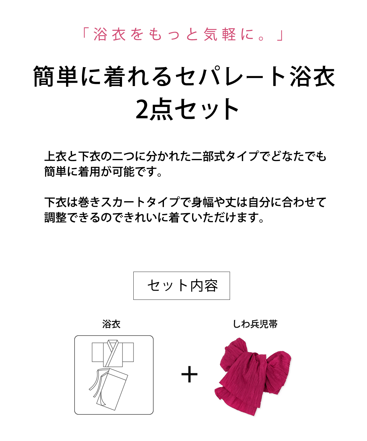 二部式 浴衣 セット フリーサイズ 夏祭りや花火大会に。初めての方でも安心して簡単に着付けが出来る新感覚のセパレートの浴衣と人気の兵児帯のお得なセットです。今年こそ浴衣を着たいけれど着付けに自信がない、着くずれが不安、そんなお客さまでも安心。 セパレート浴衣は初心者の方でも洋服感覚であっという間に着付けが出来ます。 また、着付け用小物も必要ありません! 浴衣の上衣は、紐付きなので、腰紐なしで着られます。 スカートは、巻きスカートタイプ、 身丈や身幅は、体型に合わせて自由に調整可能で手軽に和の雰囲気を楽しみたい方にぴったりの一枚です!簡単に本格的な浴衣姿をお楽しみいただけますので京都スタイルのセパレート浴衣でぜひ今年の夏を満喫ください。■サイズ浴衣 上着丈:53cm 裄:68cm 袖丈:49cm スカート丈:96cm 適応身長:152~167cm前後 ■素材 綿100%■シーン 夏祭り 花火大会 盆踊り デート フェスなど 簡単に着れるので留学先へのお土産や外国人へのプレゼントにもおすすめです。京都スタイルではお手頃価格の浴衣を沢山取り揃えております。 [ショップについて] 京都スタイル (kyotostyle)では 浴衣 ユカタ ゆかた yukata セット セット 浴衣セット set 単品 二部式 セパレート 2024 2025 新作 新柄 女性 女子用 女の子 レディース ガールズ ジュニア 大人 子供 小学生 中学生 高校生 大学生 10代 20代 30代 40代 50代 60代 S M L LL 3L LLL 4L LLLL 5L LLLL free フリー フリーサイズ プチサイズ クィーンサイズ ふくよか 大きいサイズ 大きめ 小さいサイズ 小さめ トールサイズ レトロ レトロモダン モダン 大正ロマン 大正ロマン ハイカラ 昭和レトロ アンティーク ガーリー フェミニン ポップ かわいい 可愛い 大人可愛い 大人かわいい おしゃれ かっこいい 格好いい クール 大人っぽい モード 個性的 渋い シンプル 人気 高級 ブランド 特価 安い 激安 お値打ち プチプラ の浴衣や 下駄 浴衣下駄 桐下駄 ゲタ geta 巾着 キンチャク かごバッグ アタバッグ 帯 浴衣帯 半幅帯 半巾帯 作り帯 結び帯 付帯 兵児帯 ヘコ帯 ヘコオビ 着付けセット 着付け小物 を お急ぎ 即日発送 土日発送 あす楽 最強配送 最強翌日配送 で幅広く取り揃え 京都から発送いたします [シーン・行事] お祭り 花火 花火大会 夏祭り夏 祭 フェス 写真 写真撮影 家用 普段着 衣装 コスプレ インスタ映え 浴衣デート 浴衣女子 イベント 女子会 旅行 ギフト プレゼント 贈り物 海外の方へのプレゼント におすすめです [カラー・柄・生地について] 赤 臙脂 白 生成り 黒 紺 青 水色 紫 緑 黄緑 茶色 レッド ワインレッド エンジ ボルドー ピンク ホワイト オフホワイト ブラック ブルー グリーン ネイビー パープル ブラウン ミント カーキ アイボリー くすみ くすみカラー アースカラー カラフル モノトーン 和柄 古典柄 古典 鹿子 絞り風 麻 菊 キク 椿 つばき ツバキ 梅 うめ 牡丹 ボタン 秋桜 コスモス 薔薇 バラ 撫子 なでしこ 向日葵 ひまわり ヒマワリ 朝顔 アサガオ 紫陽花 あじさい 百合 ユリ ゆり 桜 さくら サクラ 花 花柄 金魚 きんぎょ 幾何学 市松 矢絣 ストライプ 縦縞 蛍 蝶 綿 コットン 綿100% 麻 綿麻 清涼感のある高級生地で 豊富なカラー 柄を取り揃えております|涼を感じる、大人の浴衣。| お祭りや花火大会等、夏のイベントに活躍してくれる浴衣。 浴衣がセパレートになっているので、届いたらすぐに洋服感覚で着用できます。 さわやかな柄からモダンな柄まで、バリエーション豊かなラインナップ。 素材は綿100%で通気性が良く、暑い日もさらっとした快適な着心地。 季節を感じる浴衣でこの夏を満喫してください。 ディスプレイにより色が違って見える場合があります。