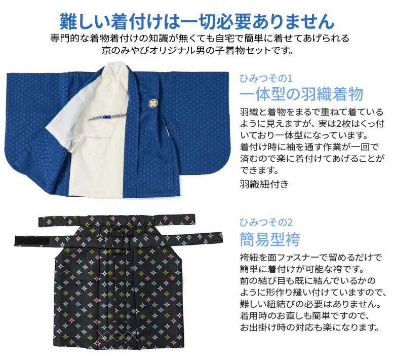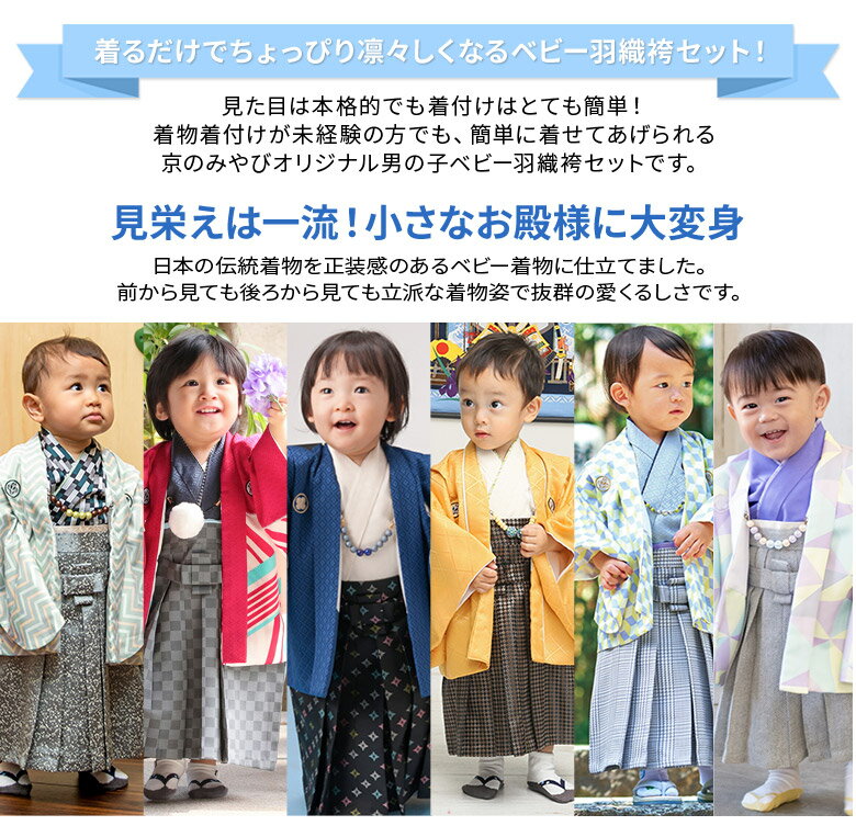 配送について◆当商品はメール便発送不可です。※規格サイズを超えるため。納品書について当店では納品書は同封しておりません。ご希望の方は備考欄に「納品書希望」とご記入ください。商品について1才祝いや初節句・お正月におすすめ♪大人顔負けの凛々しい姿に大変身。見た目は本格的でも、着付けはとっても簡単!着物の着付けが未経験の方でも、簡単に着せてあげられるように、当店が工夫を重ねてこしらえた、アイディアと可愛さ満タンのベビー着物です。セットは一体型の羽織&着物と袴に分かれています。着物は赤ちゃんの肌着を着せるのと同じような仕様です。袴は面ファスナーで後ろで留めるタイプなので、体型に個人差があるお子様でも簡単に着付けが出来ます。出産祝いのプレゼントとしてもオススメです!ご注意・ビーズ羽織紐・袴は、色移りする恐れがありますので、保管の際は、着物などの衣類に触れないようにご注意ください。・ビーズ羽織紐のデザインは入荷時期により変わる場合があります。・家紋の変更はできません。・本品はポリエステル素材のため、中に綿素材など普段お使いの肌着を着られることをお勧めします。 ・着用後の返品・交換、またはしつけ糸を取った場合の返品・交換はお受けできません。・オプションを注文の場合は、ご注文後に価格を訂正し受注メールでご案内いたします。※プルダウンで選択できないオプションは売り切れとなっています。・ご覧の環境(モニター設定等)や入荷時期により色みが若干異なります。ラッピングについて※当商品は箱には入っておりません。プレゼント用のラッピングや熨斗(のし)をご希望の場合は、ギフトボックスを別途ご注文ください。サイズ【適応身長】1才 80cm前後袴紐下丈:35cm羽織丈:40cm裄:36cm(肩上げ済)袖丈:32cm※商品により多少前後します。素材ポリエステル製造中国