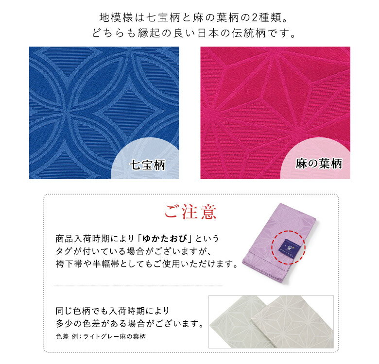 浴衣帯 半幅帯 袴下帯 七宝柄 麻の葉柄 黒 白 黄色 青 水色 紺 赤 緑 黄色 黄緑 紫 からし色 オレンジ ワイン ピンク ブラック グレー ホワイト ネイビー ブルー 卒業式袴