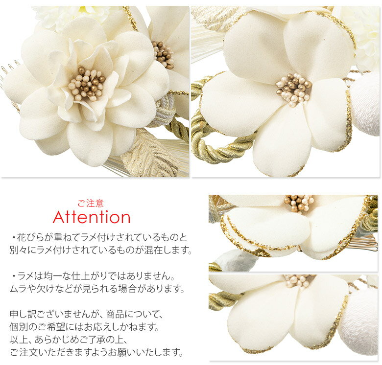 配送について◆当商品はメール便発送不可です。※規格サイズを超えるため。納品書について当店では納品書は同封しておりません。ご希望の方は備考欄に「納品書希望」とご記入ください。商品について組紐、タッセル、ダイヤストーンなど異素材を組み合わせたゴージャスな髪飾り。花びらのふちの金ラメや、ダイヤストーンのUピン飾りがほどよいアクセントに。成人式の振袖や卒業式の袴姿、ウエディングや婚礼衣装などにおすすめです。 ご注意・商品の特性上、施されているラメは多少落ちることがございます。・花びらが重ねてラメ付けされているものと、別々にラメ付けされているものが混在します。・ラメは均一な仕上がりではありません。ムラなどが見られる場合があります。・パーツの色味や種類が多少変わる場合があります。・ご覧の環境(モニター設定等)や入荷時期により色みが若干異なります。留め具タイプ/サイズ【大】コーム/12×12cm【中】Uピン/7×7cm【小】Uピン/3×4.5cm(下がり5cm)※商品により多少前後します。※ケース入り 素材メイン飾り:レーヨン金具:鉄製造日本