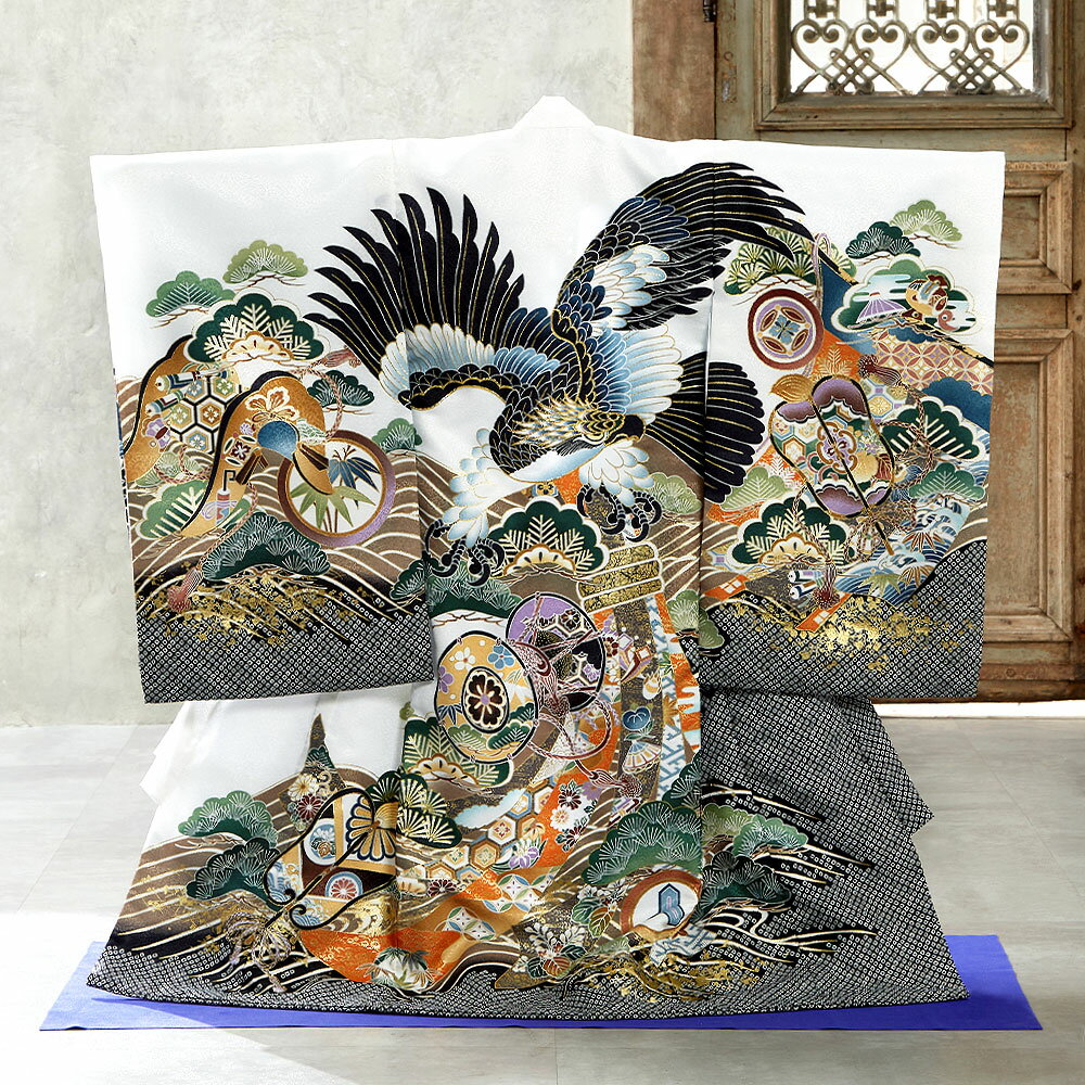 ★【レンタル】産着 お宮参り セット レンタル 男の子 初着 御宮参り 祝い着 5点 フルセット 着物 帽子 よだれかけ 扇子 お守り 赤ちゃん 初宮参 男児 レンタル着物 お祝い お宮参り用 記念撮影 / 白 鷹 鼓 軍配 波 松 宝尽くし 絞り風 刺繍