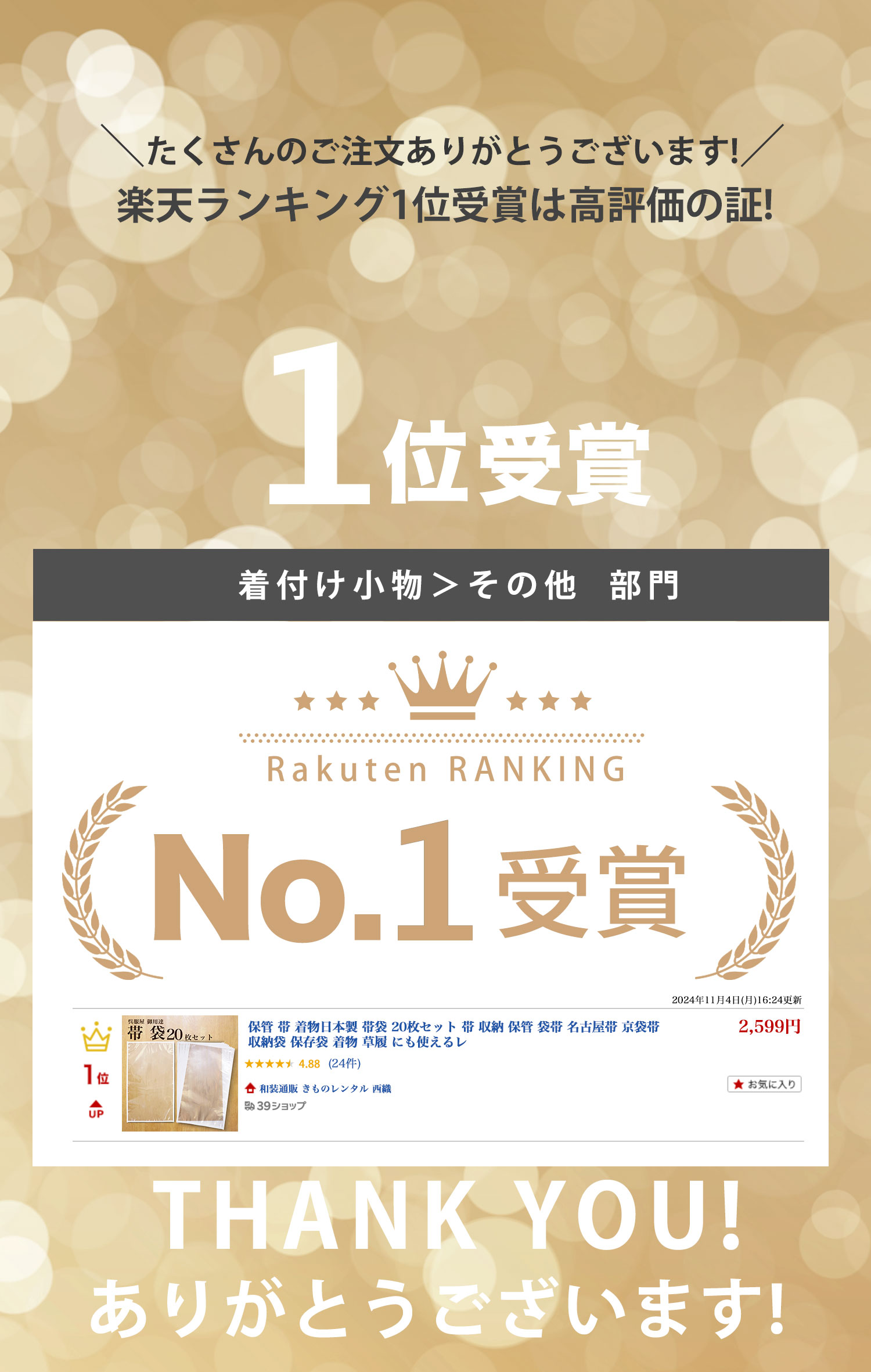 商品詳細 日本製の袋帯専用保存袋お得な20枚セットです。 スペック ・素材:ポリプロピレン・サイズ:横:約36cm 縦:約61.5cm ・セット内容:20枚組 商品説明 大切な帯を美しく保管「帯袋」 お気に入りの帯を、きれいに保管したい方に。 和装専門店が提案する、帯専用の収納袋です。 帯の型崩れ・汚れから守る 箪笥の中やクローゼットでもコンパクトに収納できます。 透明仕様で使いやすい 中にどの帯が入っているか一目で分かる透明仕様 複数の帯をお持ちの方にも整理整頓しやすい仕様です。 大切な帯をきちんと収納したい方へ。 こんな方におすすめ ・複数の帯を整理したい方 ・季節ごとに帯を入れ替えて保管している方 ・帯の保護や型崩れ対策をしたい方 ・着付け教室や出張用に持ち運びたい方 まとめ買いにも最適! 使う帯が増えるたびに、あると便利なアイテムです。