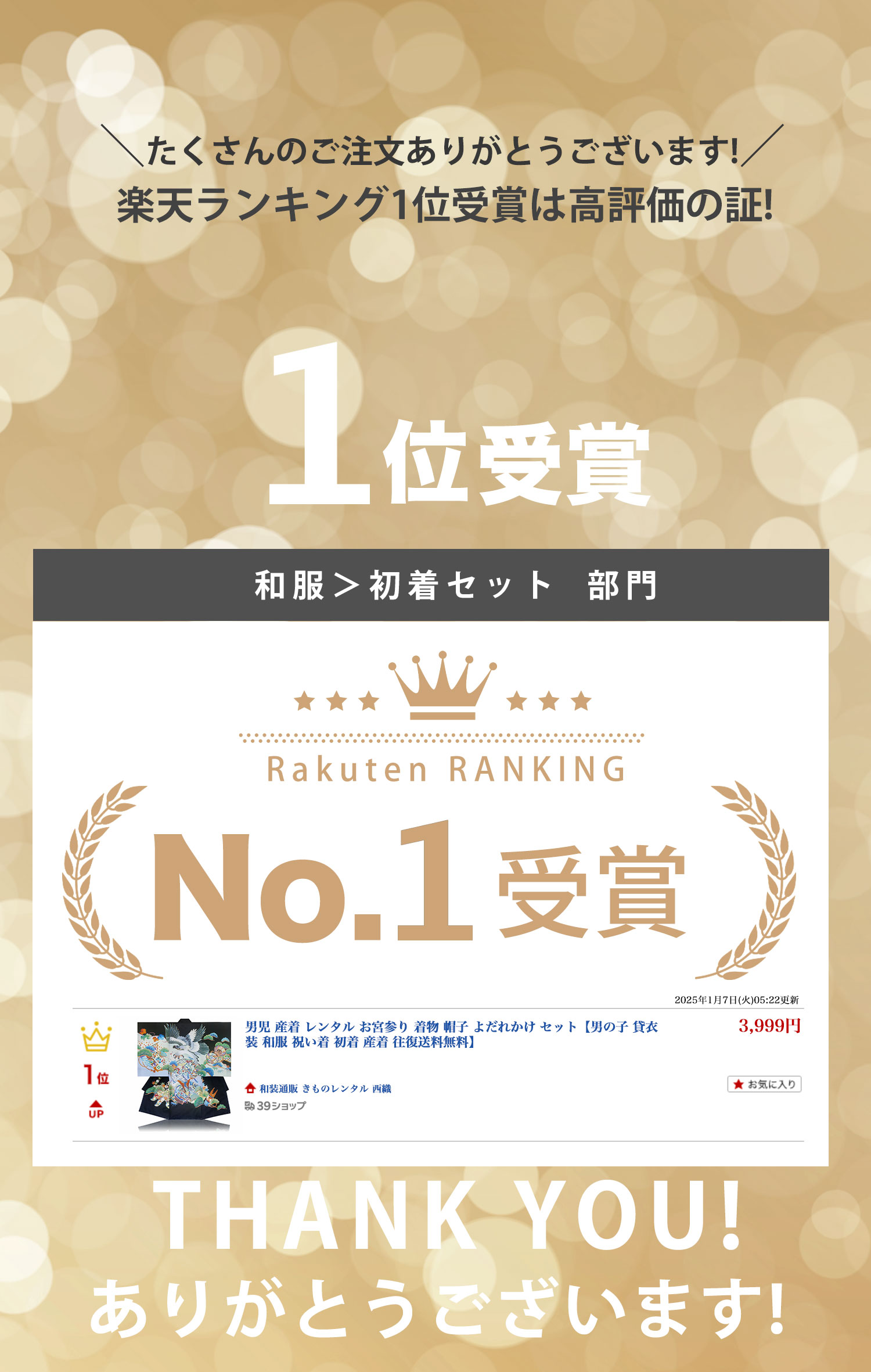 商品詳細 レンタル期間 3泊4日(商品はご着用日の2日前に到着するよう発送致します。) 素材着物 表地絹100%豪華絞り染め・手刺繍があしらわれた1点物の熨斗目です。 内容 産着本体(商品によって襦袢異なります) よだれかけ 帽子 お守り オプション ベビードレスセット+3300円 ドレスとオーバーオールのセットです。(※ドレスのみ返却必要) 注意事項 ご予約について予約カレンダーが「×」でも、システムの都合上注文が出来てしまいます。 ご予約の可否等は、メールにてご連絡させていただきますので、必ずメールを受信出来る状態でご注文をお願い致します。 メールにてご連絡が出来ない場合のトラブルについては、責任を負いかねますので予めご了承下さいませ。 商品について 万が一商品が異なる場合は、お手数ですが至急ご連絡ください。 即日交換を手配出来ない場合は、全額返金とさせていただきます。 レンタル商品の性格上、商品の多少の汚れ・使用感は御容赦願います※ 交換対象とはなりませんのでご了承ください。 発送について レンタル商品の配送は、沖縄、北海道、離島の場合、送料が往復『+2,000円』掛かりますのでご注意下さい。★★★ご予約状況はこちら★★★○→ご予約可能 ×→ご予約不可 ※当店のレンタル商品は年中ご対応をしております。 その為「ご予約不可」の場合でもご注文が可能なシステムとなっております。 当店から「ご予約完了」のご案内が届くまではご予約確定では御座いませんのでご注意くださいませ。