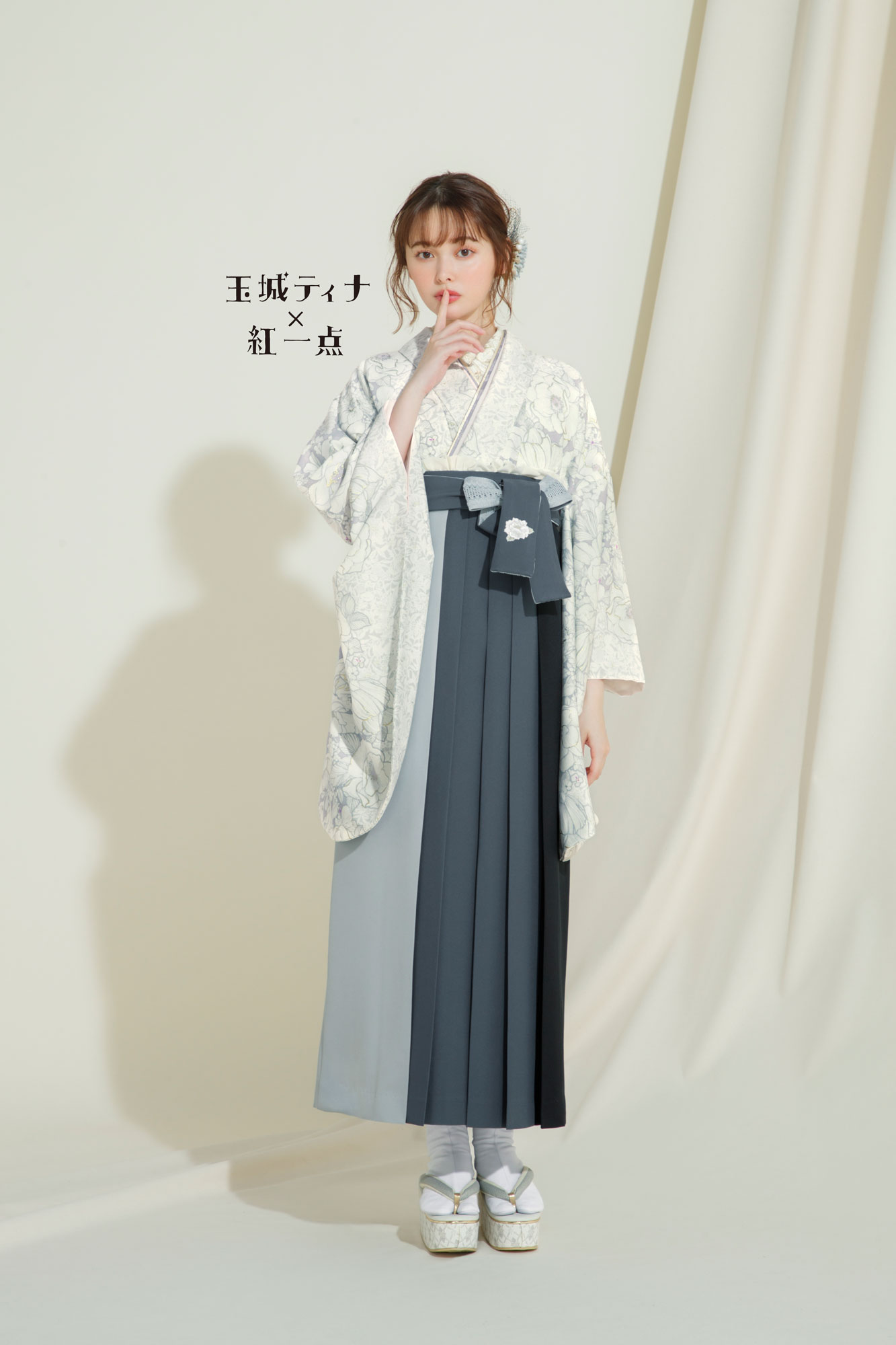 【レンタル】玉城ティナ×紅一点 二尺袖 着物 袴 フルセット和服 袴 モダン レトロ はかま【貸衣装 卒業式 大学生】【袴 Mサイズ】個性派 フェミニンクリーム ベージュ オフホワイト グレイ 灰色【IN32】
