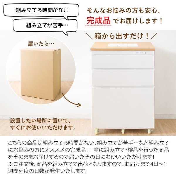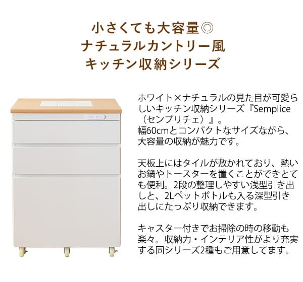 ホワイト×ナチュラルの見た目が可愛らしいキッチン収納シリーズ『Semplice(センプリチェ)』。幅60cmとコンパクトなサイズながら、電子レンジも置ける大容量収納が魅力です。天板上にはタイルが敷かれており、熱いお鍋やトースターを置くことができとても便利。2段の整理しやすい浅型引き出しと、2Lペットボトルも入る深型引き出しにたっぷり収納できます。キャスター付きでお掃除の時の移動も楽々。収納力・インテリア性がより充実する同シリーズ2種もご用意しております。商品名キッチンチェスト Semplice(センプリチェ)サイズ幅60.2×奥行42.5×高さ85cm材質合成樹脂化粧繊維板(塩化ビニル)、プリント紙化粧繊維板、タイル耐荷重天板:20kg、引き出し:3kg、深型引き出し:30kg備考完成品、コンセント付き、天板タイル耐熱温度:120度※ご注文後、商品を組み立てて出荷となりますので、お届けまで4日〜1週間程度の日数が発生いたします。予めご了承ください。キッチンラック キッチン収納 レンジラック 炊飯器ラック ガラス扉 ナチュラルカントリー ホワイトホワイト×ナチュラルの見た目が可愛らしいキッチン収納シリーズ『Semplice(センプリチェ)』。幅60cmとコンパクトなサイズながら、大容量の収納が魅力です。天板上にはタイルが敷かれており、熱いお鍋やトースターを置くことができとても便利。2段の整理しやすい浅型引き出しと、2Lペットボトルも入る深型引き出しにたっぷり収納できます。キャスター付きでお掃除の時の移動も楽々。収納力・インテリア性がより充実する同シリーズ2種もご用意しております。商品名キッチンチェスト Semplice(センプリチェ)サイズ幅60.2×奥行42.5×高さ85cm材質合成樹脂化粧繊維板(塩化ビニル)、プリント紙化粧繊維板、タイル耐荷重天板:20kg、引き出し:3kg、深型引き出し:30kg備考完成品、コンセント付き、天板タイル耐熱温度:120度※ご注文後、商品を組み立てて出荷となりますので、お届けまで4日〜1週間程度の日数が発生いたします。予めご了承ください。