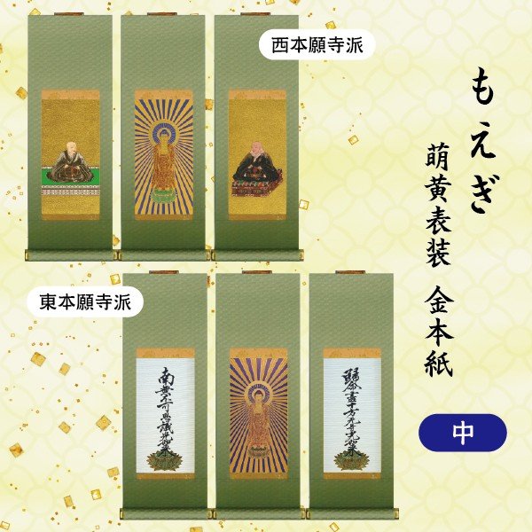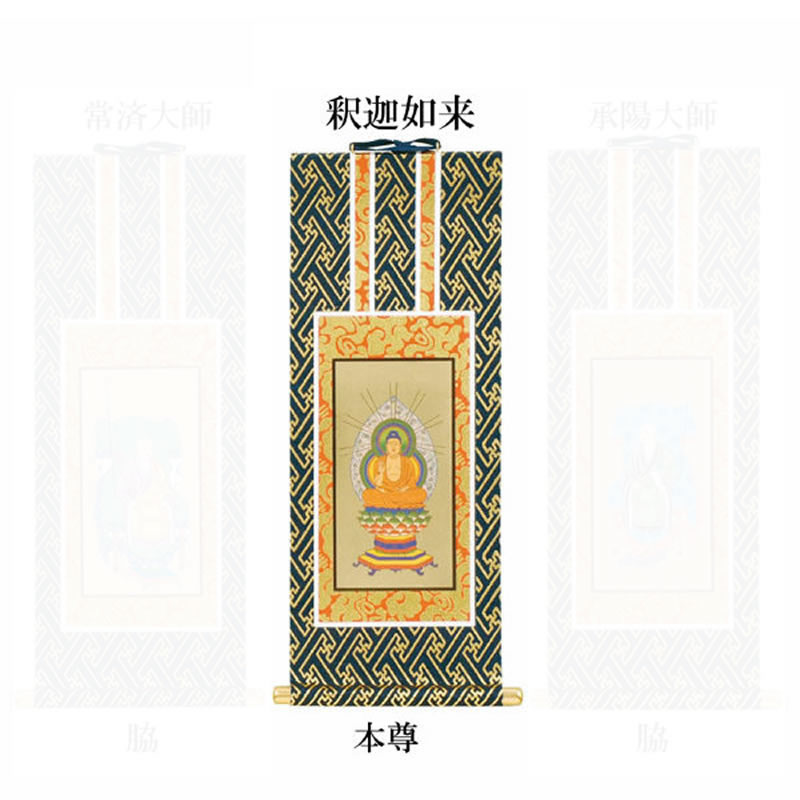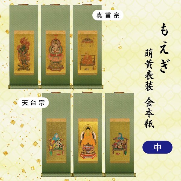 【 ご注文数量で選べる3パターン】 数量1=本尊 数量2=両脇掛 数量3=本尊+両脇掛掛軸 もえぎ 萌黄表装 金本紙(中) 日本製