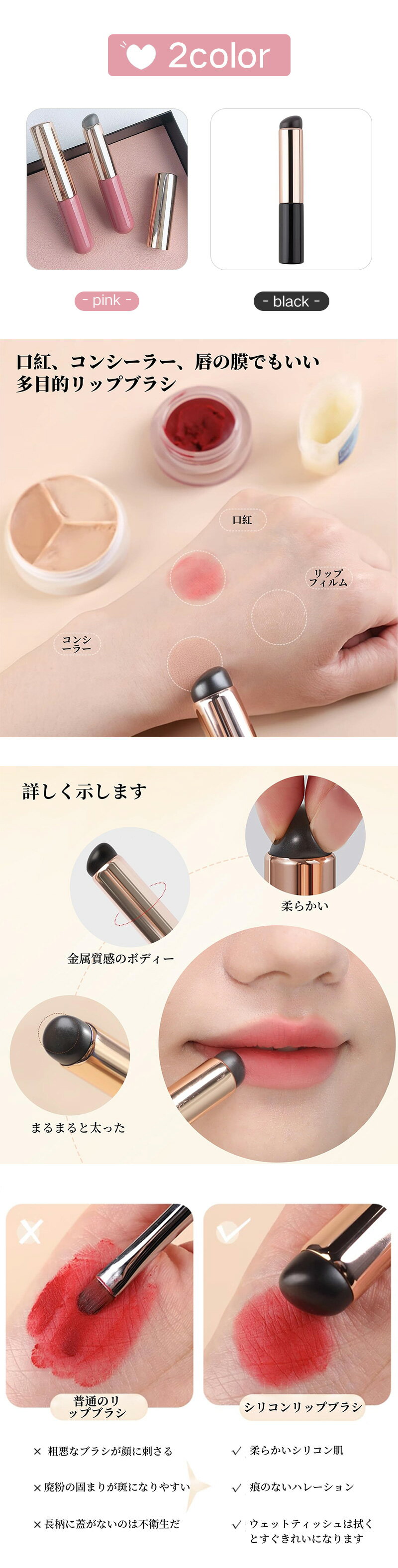 口紅ブラシ【2本入】メイクブラシ リップブラシ シリカゲル 柔らかい 多機能 口紅リップブラシ 化粧道具 持ち運び便利 旅行用 出張用 初心者