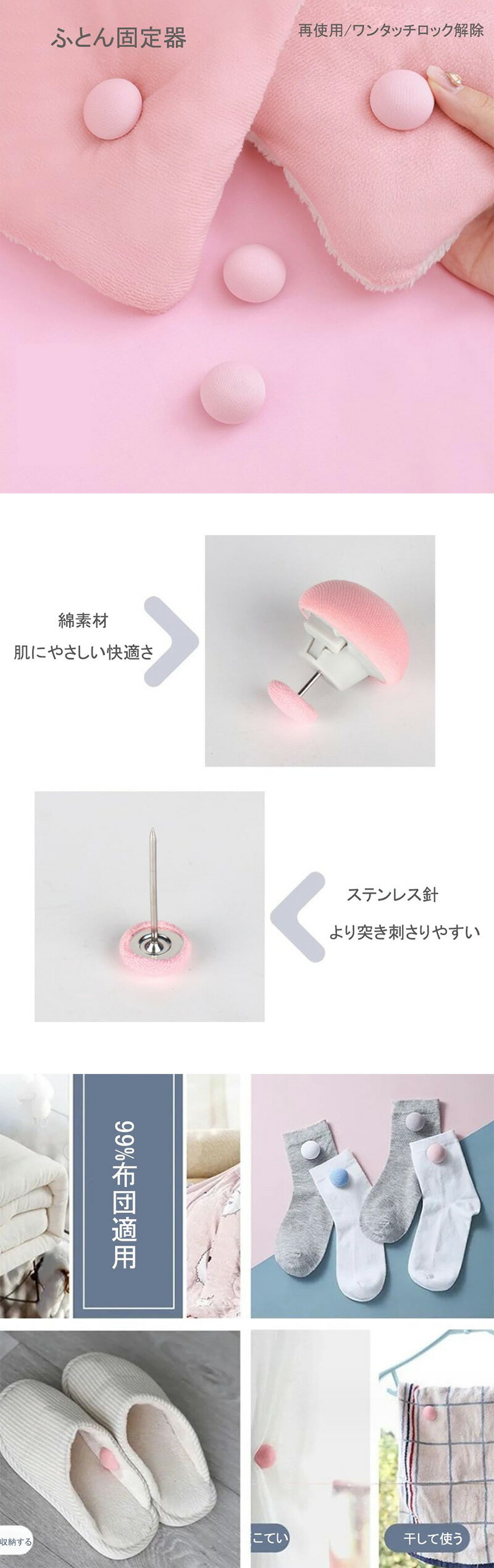 ※ご注意 ※モニター発色の具合により色合いが異なって見える場合がございます。 商品詳細 【特徴】 【高品質の素材】肌にやさしい純綿素材を使用しており、快適な感触を提供します。冬でも寒さを感じにくく、心地よい眠りをサポートします。台座は耐久性に優れたABSプラスチック製で作られていますので、長期間使用することができます。 【セット内容】きのこ布団クリップ16個セット。カラー:グレー/ピンク しっかりと布団を固定し、安定感を与えます。 (注意:異なる撮影ツールによって出来上がった色は異なりになります)。 【可愛いきのこ設計】キノコのデザインが可愛いので、布団の飾りとしてもおしゃれです。角のないキノコ型の布団クリップなので、お子さんやペットのいるご家庭でもお使いいただきやすいです。 【操作便利】布団にクリップを通して、反対側の穴に釘を挿してボタンを押すだけで簡単に固定することができます。取り外す際も、ボタンを押すだけでロックを解除できるので、便利です。 【幅広い用途】布団だけでなく、カーテンストラップとして機能するカーテンの固定にも使用でき、靴下の保管にも使用でき、より実用的です。便利で多機能なアイテムです。絶妙な、軽量で美しい、家のための素晴らしい装飾です。
