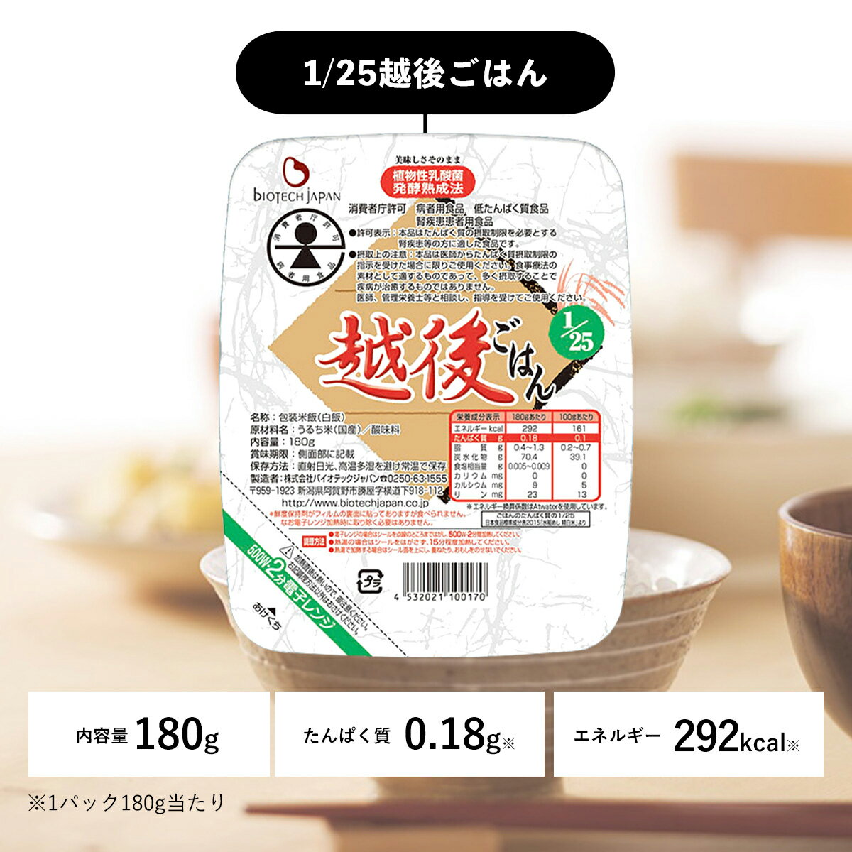 腎臓病食 低たんぱく米 1/25越後ごはん 1ケース(180g×20パック) 国産 低たんぱく食品 低タンパク米 低たんぱく ごはん 低たんぱくごはん 腎臓病レトルト食 バイオテックジャパン