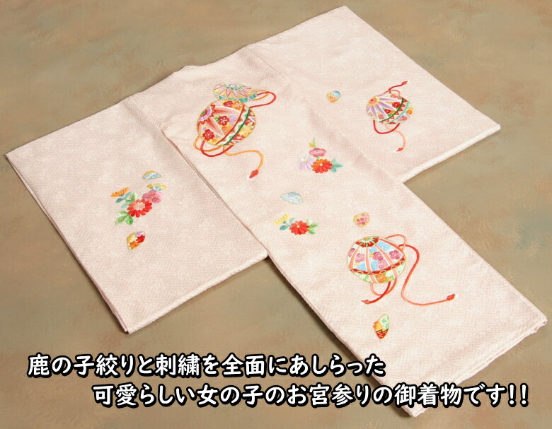 【送料無料】鹿の子絞りと刺繍を全面にあしらった可愛らしい女の子のお宮参りの御着物です。 入っている柄はすべて鹿の子絞りと刺繍で表現されたシンプルな柄域ながら非常に豪華な仕様になっています。 珍しい淡いピンク色の鹿の子絞りは遠目で見ると白っぽく近くで見るとピンクぽく見える為、見る位置や角度により違う表情を見せるのも特徴です。 御着物生地は魔除けの意味合いのある紗綾型の文様が織り込まれた地紋生地になり、絹生地特有の程よい光沢感のある正絹綸子地紋生地をベースに使用しています。 生地全体は総本絞り特有の非常にボリュームのある生地感になります。 お宮参り着物に合わせた袷仕立ての長襦袢もセットになっており御着物と長襦袢の前身頃には初めから紐も縫い付けてありますので仕付け糸を解いて頂ければすぐに御使用になれます。 御仕立て直しして頂ければ被布を合わせることで七五三の三歳の御着物として着ていただけます。 御着物を収納する専用の文庫紙(たとう紙)や「寿」の金彩箔文字が入った化粧箱にお入れ致します。 ※家紋入れもご希望で承りますので(有料)お気軽にご相談下さい。 納期プラス1週間から10日前後、料金5,800円~商品情報 商品番号 ku-052512585-2u 使用対象 お宮参り 百日参り 百十日参り など 商品内容 御着物 長襦袢 化粧箱 衣装収納文庫紙(たとう紙) 柄・特徴 総鹿の子本絞り まり 柄刺繍使い 紗綾地紋生地 色目 淡いピンク 素材 着物 表 絹100% 着物 裏 ポリエステル100% 長襦袢 ポリエステル100% 寸法 身丈 約96cm 袖丈 約56cm 裄丈 約45cm ※サイズは特に関係なく御使用になれます ご注意 ※専用の袋の中にたたんで収納されているため軽いタタミしわがついている場合がございますのでご了承下さい ※生地の裁断位置により多少柄の出方が変わることがございます ※染め物ですので細かい染料とび(気にならない程度の物)はご了承下さい 鹿の子絞りと刺繍を全面にあしらった可愛らしい女の子のお宮参りの御着物です!! 入っている柄はすべて鹿の子絞りと刺繍で表現された非常に豪華な仕様になっています!! 珍しい淡いピンク色の鹿の子絞りは遠目で見ると白っぽく近くで見るとピンクぽく見える為、見る位置や角度により違う表情を見せるのも特徴です!! 御着物生地は魔除けの意味合いのある紗綾型の文様が織り込まれた地紋生地になり、しっかりとしたコシとボリュームのある質感になります! 絹生地特有の程よい光沢感のある正絹綸子地紋生地をベースに使用しています! 御着物と長襦袢の前身頃には初めから紐も縫い付けてあり仕付け糸を解いて頂ければすぐに御使用できます!! お宮参り着物に合わせた袷仕立ての長襦袢もセットで御付け致します!! 袖には長襦袢以外に飾り袖(付け袖)も付いています!! 「寿」の金彩箔文字が入った化粧箱にお入れして専用の収納するタトウ紙も御付けいたします!! (デザインは変わることがございます)
