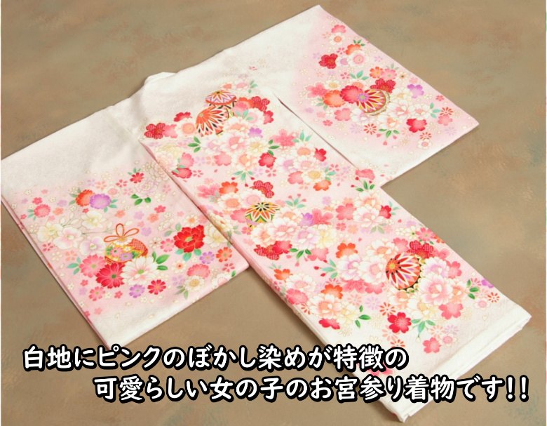 お宮参り 着物 女の子 絹100% 正絹初着 白地ピンクボカシ 鈴 八重桜 胡蝶蘭 金彩使い 紗綾地紋生地