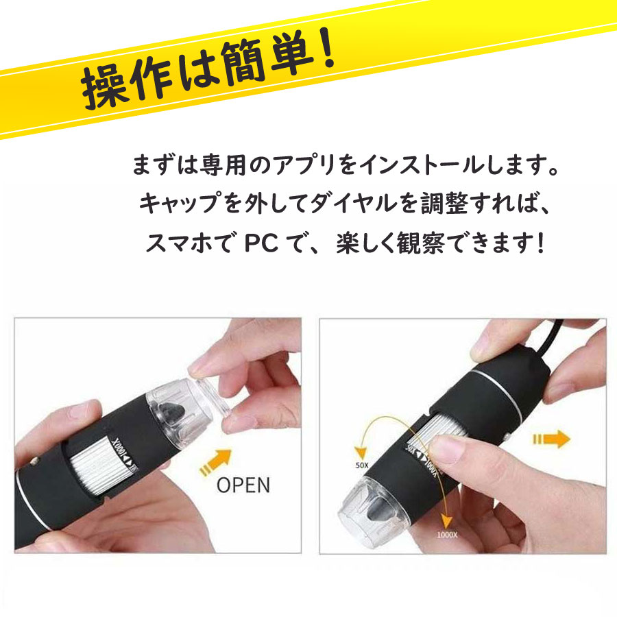 ※対応可能な端末はandroidスマホ 2種類(type-Cとmicro-USB)、パソコンも対応可能です。 ※在庫の関係でワンランク上の最大1600倍顕微鏡を手配する場合がございます。 ※androidスマホの場合は、OTG機能をONにしてからのご利用をお願い致します。 ※格安スマホ(中国製XIAOMI、OPPO、京セラ製品、AQUOS Senseシリーズ等)対応不可機種がございます。 ※被写体を大きく拡大したい場合は、サイズの大きいモニター(PC等)をご利用ください。 商品内容 ・商品名:デジタル顕微鏡 K30 ・画素数:30万画素 ・拡大倍数:最大1000倍 ・焦点距離:0~4cm ・画像種類:JPG ・動画種類:MP4/AVI ・USB接続口種類:USB3.0/2.0/1.0 ・対応システム:androidスマホとパソコンのみ ・対応機種OS:android6以上、Windowsvista/7/8/10/11、Mac OS X11.0以上 ・付属品:顕微鏡本体/顕微鏡台座/電源ケーブル/日本語説明書/英語説明書 ※北海道、沖縄に関しましてはレターパックでの発送となります。ご了承ください。 ※当商品で使用するアプリはiPhone、androidタブレット非対応となります。ご注意ください。 ※対応可能な機種は7枚目画像に記載したように、androidスマホ 2種類とパソコンです。 ※androidスマホの場合は、OTG機能対応の機種のみご利用して頂けます。OTG機能はOFFした場合はONにしてからのご利用をお願い致します。 ※格安スマホ(中国製XIAOMI、OPPO、京セラ製品)対応不可機種がございます。 ※シャープ製品(AQUOS Senseシリーズ等)は対応不可機種がございます。 ※家庭向け商品となります。 ※被写体を大きく拡大したい場合は、サイズの大きいモニター(PC等)をご利用ください。 対象:小学校/中学/高校/学生/社会人/大人/男性/女性/男の子/女の子/初心者/中級者/ 用途:調査/アウトドア/公園/旅行/バレンタイン/子供の日/七五三祝い/入園お祝い/入学お祝い/初心者/地質調査/昆虫観察/硬貨観察/電子回路/機械検査/実験/課題研究/自由研究/正月/景品/新生活/夏休み/春休み/プレゼント/誕生日/バースデー/お祝い/ギフト/クリスマス/家庭用/学習用/鉱物調査/昆虫調査/頭皮/皮膚/ 【注意事項】 以下の点には十分にお気をつけください。 ・こちらの機種に関しましては、業務用ではなく家庭用の入門機となります。 ・商品到着時の初期不良は交換保証対象となります。商品到着後は速やかに動作確認を行ってください。 ・ご購入後不良品以外の返品、返金、キャンセルは不可です。 ※仕様については予告なく変更される場合がございます。予めご了承ください。 ※ご不明な点があれば購入前にお問合せください。 アフター対応 ・故障や修理のご相談、操作の疑問などありましたら、お気軽にお問合せください。 ・メール、電話にて対応しております。 ・品質保証に関しまして: ・次の場合は、保証期間中でも保証の対象とはなりません。 ・使用上の誤り、及び取扱説明書に記載の推奨環境以外でのご使用による故障及び損傷。 ・弊社以外で改造や修理、分解による故障及び損傷。 ・火災・地震・水害・その他外的要因による故障及び損傷。 ・他の装置等への組み込みや連結された場合に生ずる故障及び損傷 ・過負荷等、お取り扱い上の不注意、誤ったご使用方法による故障及び破損