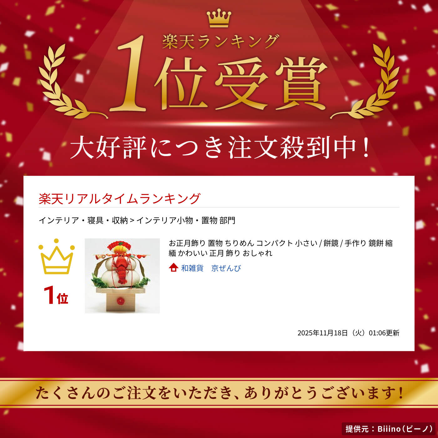 サイズ奥行15.0cm、幅15.0cm、高さ21.0cm素材/材質レーヨンちりめん、木材 ほか特徴お正月に欠かせない鏡餅を華やかに演出した「餅鏡」です。重ね餅の上には、長寿や繁栄を象徴する伊勢海老を大胆にあしらい、新しい一年をより縁起良く迎えることができます。木製の台座に乗せられた姿は存在感がありながら、卓上や玄関など限られたスペースにも飾りやすいコンパクトサイズ。職人の手仕事を感じさせる丁寧な仕上がりで、日本の伝統美と現代の暮らしに馴染むデザインとなっています。リビングや和室はもちろん、洋風のお部屋やオフィスにもよく映える華やかな正月飾り。新しい年の始まりにぴったりの一品です。注意事項■商品の撮影には最大限注意を払っておりますが、閲覧時のモニター環境によりましては実際の商品と若干違うお色味に映ることもございます。 こちらの商品は実店舗でも販売しております関係上、ご購入のタイミングによっては品切れが発生する場合もございます。 大変恐れ入りますが、その場合はキャンセル対応をさせていただきますこと、予めご了承ください。生産地日本検索キーワード鏡餅 餅鏡 正月飾り しめ飾り 迎春飾り お正月飾り 縁起物 伊勢海老飾り 伊勢海老 鯛 松竹梅 おめでたい飾り 縁起小物 魔除け 厄除け 福招き 家内安全 商売繁盛 五穀豊穣 無病息災 長寿祈願 健康祈願 幸運祈願 金運祈願 福運祈願 運気上昇 祝い飾り 祝い小物 初春飾り 新年飾り 新春飾り 卓上飾り コンパクト飾り ミニサイズ飾り 玄関飾り リビング飾り 和室飾り 洋室飾り デスク飾り インテリア飾り 和風雑貨 和小物 和風小物 日本製 高級感 おしゃれ雑貨 華やか雑貨 可愛い雑貨 手作り風 ハンドメイド風 木製飾り 木製台座 和モダン 和風インテリア モダンインテリア 伝統飾り 古典飾り 正月準備 年末年始飾り 季節飾り 季節雑貨 季節小物 開運アイテム 招福アイテム お祝いギフト 新年ギフト お年賀 プチギフト 内祝い 贈り物 プレゼント 外国人向けギフト 日本土産 海外土産 和風ギフト 海外向けプレゼント おしゃれインテリア ディスプレイ小物 店舗装飾 店舗ディスプレイ イベント飾り 正月インテリア 正月オブジェ 新年オブジェ お正月置物 お正月人気 お正月定番 玄関おすすめ リビングおすすめ 飾りやすい 場所を取らない 小さな飾り 手のひらサイズ みんなで楽しむ 家族で楽しむ 子供も喜ぶ 年末年始準備 新年を祝う 初春を彩る お正月華やぎ お正月インテリア雑貨 日本の伝統 日本文化 和の心 和の飾り 和柄 和布 和の雰囲気 豪華な飾り 豪華インテリア シンプルインテリア 季節限定飾り 日本の工芸 伝統工芸 ちりめん飾り 職人技 細工丁寧 華やかな鏡餅 伊勢海老モチーフ 新年の縁起 おめでたいデザイン 鮮やかな色合い 開運祈願アイテム 正月イベント 年末年始イベント おもてなし飾り 季節限定アイテム インテリアオブジェ 日本のお正月 日本の風物詩
