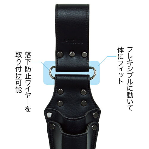 【メーカー名】 ●ジェフコム(株) 【特長】 ●高級人造皮革製のツールホルダー(ペンチ親子吊) ●丈夫で型崩れしにくい3層構造素材 ●落下防止ワイヤーを取り付け可能 ●フレキシブルに動いて体にフィット 【仕様】 ●サイズ:幅95×奥行50×高さ315mm ●質量:140g