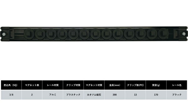 【メーカー】 ●(株)SIGNET 【特長】 ●マグネット付きで便利なホルダーです。 ●片手でソケットの着脱が可能です。 ●ソケットを回転させてソケットをロック&リリースで着脱がスムーズです。 ●上下逆さまでもしっかりとソケットを保持します。 ●強力なマグネットによりキャビネット等に自由に取り付け可能です。 ●背面マグネット部は取付対象物を傷つけにくいようクッションで保護します。 ●両サイドがネジ穴付きで、木材などマグネットの使用ができない場所にも取付可能です。 ●クリップ数が13個と多く、主要サイズをスッキリ整理できます。 【仕様】 ●レール色:ブラック ●全長(mm):390 ●クリップ数(PC):13 ●質量(g):170 ●差込角(SQ):3/8 ●マグネット数:2枚 ●レール材質:アルミ ●クリップ材質:プラスチック ●マグネット材質:ネオジム磁石 【注意事項】 ※磁力が強力なため、磁気の影響を受けやすい機器類の近くで使用しないでください。 ※レールは非常に強いマグネットなので、指等を挟まないよう注意してください。 ※ソケットは付属しません。 【JANコード】 4712818963441