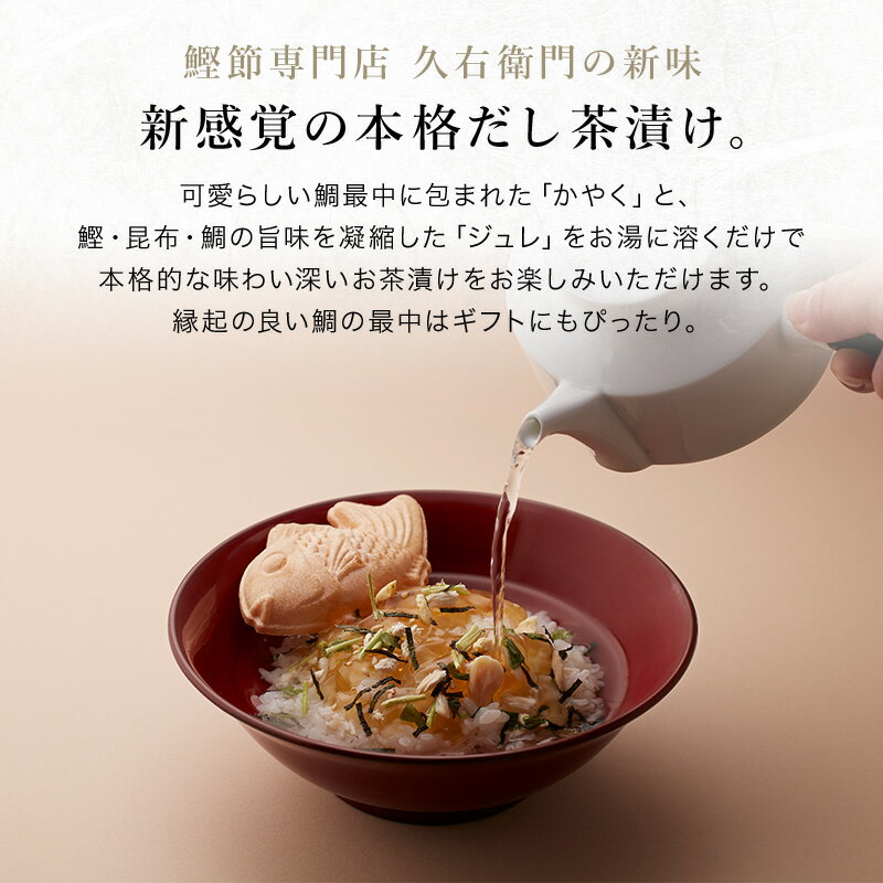 ギフト包装についてはこちら手提袋はこちら 商品詳細名称お茶漬けの素詰合せ内容量6食入(鯛茶漬け4食、梅入り鯛茶漬け2食)原材料名【かやく入り最中】最中皮(もち米(国産))、鯛フレーク(たい、食塩、デキストリン)、焼きのり、ごま、三つ葉、ゆず/調味料(アミノ酸)、酸化防止剤(ビタミンE)【だしジュレ】しょうゆ(国内製造)、水あめ、還元水あめ、かつおエキス、みりん、たいエキス、昆布エキス、清酒、食塩/ゲル化剤(増粘多糖類)、唐辛子抽出物【だしジュレ(梅)】梅干(梅、食塩)(国内製造)、しょうゆ、食塩、水あめ、還元水あめ、みりん、かつお節、清酒、昆布エキス/ゲル化剤(増粘多糖類)、唐辛子抽出物サイズ20×30×4cm賞味期限製造日より180日保存方法直射日光、高温多湿を避け、常温にて保存ください。お召し上がり方1.お茶碗に六分目のご飯をよそい、「だしジュレ」を一つ乗せてよくほぐします。2.「鯛型最中」の中からかやくを取り出し、ご飯の上にふりかけます。3.「鯛型最中」をご飯の上に乗せ、お好みでお湯またはお茶を注げばできあがりです。製造者株式会社 林久右衛門商店アレルギー 小麦 / ごま / 大豆 雑誌掲載実績あり! ソワニエ+総力編集「福岡の手みやげ」に掲載されています。\手軽でおいしい!/おすすめのギフト 創作茶漬け 鯛茶漬け 6食入 3,960円 最中お吸物・お味噌汁 詰合せ 6椀入 3,250円 久右衛門 お吸物詰合せ 12椀入 4,990円 この商品を見た方におすすめギフト商品 【久右衛門だし 9g×30包入 2点セット】 4,680円 【久右衛門 お吸物詰合せ 6椀入】 2,600円 容量別商品 【久右衛門 創作茶漬け 鯛茶漬け 10食入】 6,120円 お家で楽しめるおすすめギフト商品 【久右衛門 お吸物詰合せ 15椀入】 6,120円 【本枯鰹節 近海一本釣 40袋入】 6,120円 いままでにない斬新な趣をお茶漬けという馴染みある一杯に施しました。温かいご飯にのせた鯛の最中に包まれたかやくと、素材の旨味が凝縮されたジュレをお湯で溶くだけで味わい深いお茶漬けとしてお楽しみいただけます。鰹の香り豊かな「だしジュレ」と、ほどよい酸味で肉厚な梅の実が楽しめる「梅ジュレ」の2種の詰合せです。