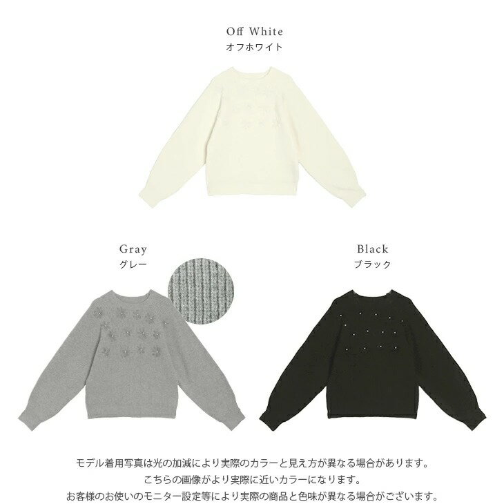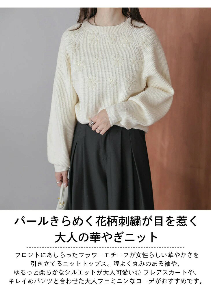 【60%OFFクーポン対象】ニットトップス 花柄 フラワー柄 刺繍 パール ぽわん袖 ラグランスリーブ リブニット フェミニン 上品 大人かわいい トップス レディース おしゃれ フリーサイズ 2025秋冬新作【atpaw25-1468】【即納:1-5営業日】【送料無料】宅込