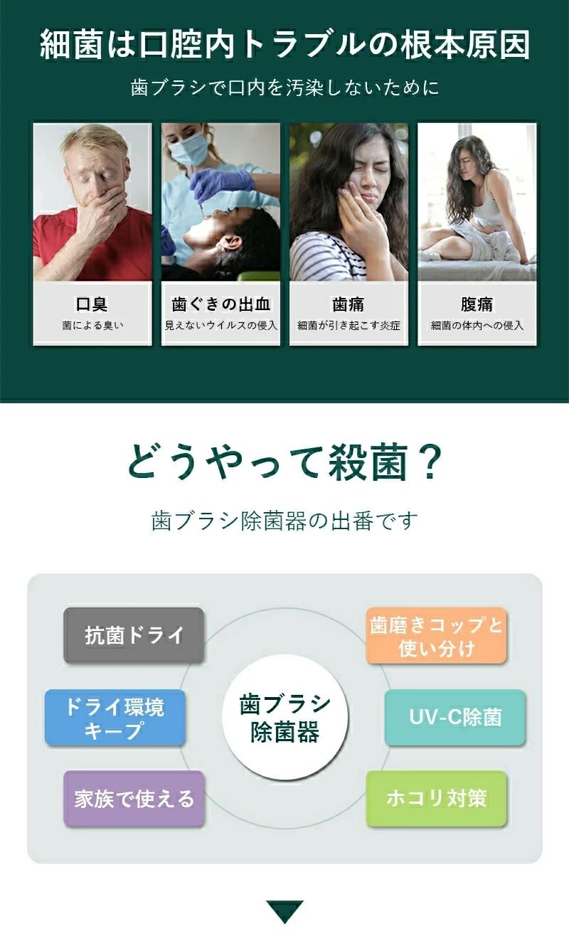 商品情報商品名:歯ブラシ除菌器カラー:ホワイト ピンク グリーンバッテリー :2000mAhオススメポイント【UV殺菌+大型収納】99.99%除菌。歯ブラシ5本で家族全員分を収納できます。電動歯ブラシにも対応。省スペースで手狭な洗面所にもおすすめです。【自動タイマー】200秒ファン乾燥+UV-C除菌、完了すると自動オフで手間いらずです。【乾燥ファン付き+接触感染防止】歯ブラシを濡れた状態で保管していると、歯ブラシ内での細菌増殖や、洗面台、浴槽、トイレなどの空気中細菌や水質菌による汚染リスクが高まります。歯ブラシ除菌器は乾燥ファン付きで、細菌の繁殖をしっかり抑え、二次汚染を予防します。【 USB充電で超便利 】省エネでお財布に優しいUSB充電式です。2000mAhの大容量バッテリーを搭載できます。歯ブラシ除菌ホルダーにより歯ブラシの寿命を延長できるため、歯ブラシの買い替え費用も抑えられます。【注意】※本製品は受注後メーカーへ発注をおかけしております。また、稀にメーカにも在庫がない場合もございます。予めご了承ください。※商品写真は、できる限り現品を再現するように画像処理などの補正を行っておりますが、ご利用のモニターや環境により差異が生じます。予めご了承くださいませ。●至急ご利用頂く場合、大量ご購入場合は事前にメールか問い合わせフォームでご連絡お願いします。●何かご不明な点、ご要望などございましたら、お気軽に問い合わせください。商品情報商品名:歯ブラシ除菌器カラー:ホワイト ピンク グリーンバッテリー :2000mAhオススメポイント【UV殺菌+大型収納】99.99%除菌。歯ブラシ5本で家族全員分を収納できます。電動歯ブラシにも対応。省スペースで手狭な洗面所にもおすすめです。【自動タイマー】200秒ファン乾燥+UV-C除菌、完了すると自動オフで手間いらずです。【乾燥ファン付き+接触感染防止】歯ブラシを濡れた状態で保管していると、歯ブラシ内での細菌増殖や、洗面台、浴槽、トイレなどの空気中細菌や水質菌による汚染リスクが高まります。歯ブラシ除菌器は乾燥ファン付きで、細菌の繁殖をしっかり抑え、二次汚染を予防します。【 USB充電で超便利 】省エネでお財布に優しいUSB充電式です。2000mAhの大容量バッテリーを搭載できます。歯ブラシ除菌ホルダーにより歯ブラシの寿命を延長できるため、歯ブラシの買い替え費用も抑えられます。【注意】※本製品は受注後メーカーへ発注をおかけしております。また、稀にメーカにも在庫がない場合もございます。予めご了承ください。※商品写真は、できる限り現品を再現するように画像処理などの補正を行っておりますが、ご利用のモニターや環境により差異が生じます。予めご了承くださいませ。●至急ご利用頂く場合、大量ご購入場合は事前にメールか問い合わせフォームでご連絡お願いします。●何かご不明な点、ご要望などございましたら、お気軽に問い合わせください。