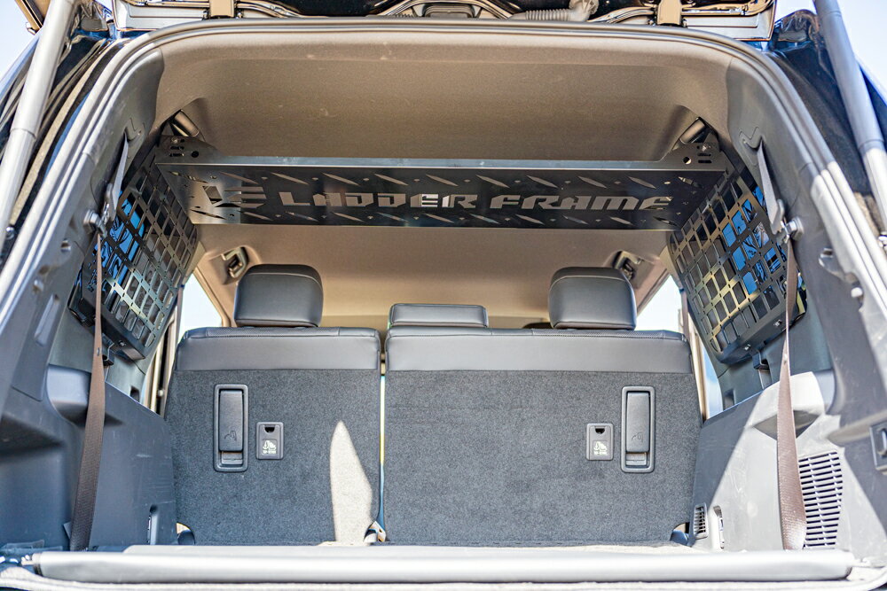 【 適合車種 】 TOYOTA(トヨタ) ランドクルーザー250 / 2024(令和6)年4月以降現行 全グレード適合(丸目、角目、対応) 棚+取付用ブラケット 【 ランクル250専用 リアラック 】 専用設計のリアラックだからできるピッタリサイズ。表面処理は純正の下塗りにも施工されている、カチオン電着塗装を採用。車内の収納をよりスマートに。 LADDER FRAME(ラダーフレーム)の切り抜きロゴ仕様。 【 アイディア一つでよりスマートに 】 素材には鉄を使用している為、マグネットも使用可能。横幅を車幅いっぱいにとっているので、長尺物もしっかり収納! 固定に便利なフック用の穴もあるので、しっかりと固定できます。 後方視界の妨げにならないように、しっかりと視界も確保! 【車内を自分だけのオリジナル空間に】 キャンプや釣り、アウトドア用品の収納、車内泊をする時の整理整頓に最適。 非常用のエマージェンシー用品、キャンプグッズ等、緊急時にもスマートに使用できます。 インナーメッシュラック同時装着OK!ラック単体でもご使用いただけます。 【 一般工具で簡単取付、穴開け無し】 専用ステーを使用している為、10mmのラチェットのみで取付可能。 アシストグリップのボルトを使用して装着し、穴開け加工も必要ありません。