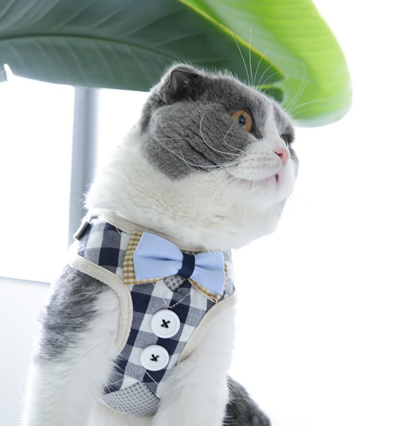 送料無料 ハーネス リード 2点セット 猫用 ネコ ペットグッズ 胴輪 散歩紐 牽引紐 平紐 チェック柄 ドット柄 蝶ネクタイ メッシュ 通気性 ナスカン 長さ調節可能 脚を通すタイプ 猫用品 猫グッズ おしゃれ おでかけ お散歩 外遊び アウトドア 公園 外出 グレー ピンク ブル