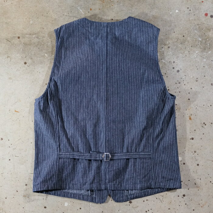 ■品番:OR-4326 ■品名:Indigo Dobby Gilet ■素材:COTTON 100% ■特徴: 1900年代初頭のジレをデザインのベースにされています。 浅めのVゾーンが特徴で、クラシックなスタイルを演出しつつ、後ろ身頃にパネル切り替えを施すことで腰回りをシャープに見せるデザインとなっております。 インディゴ染料で仕上げられたドビーストライプ生地は、経年変化による味わいもお楽しみいただけます。 ボタンにはナットボタンを採用し、細部にまでこだわりを持たせられております。 肩幅 身幅 着丈 38M 36cm 49cm 63cm 40L 38cm 32cm 60cm 42XL 39cm 54cm 64cm ※着用参考:175cm 70kg 42L着用 ※不良品以外で万一返品・交換される方は返品の送料・再送の際に発生する送料をご負担頂きますのでご了承下さい。