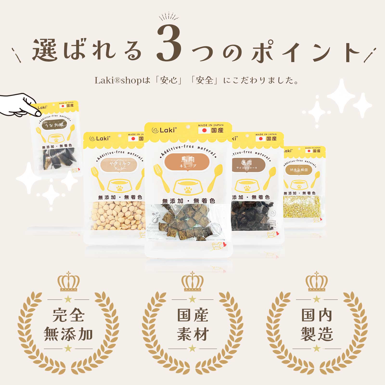 1日の給与量 体重 与える目安 ~ 5kg ~3枚 ~10kg ~5枚 ~20kg ~7枚 20kg~ ~15枚 ※1日に必要なエネルギー量の20%以下となるよう上記の給与量を目安に2〜3回に分けて与えてください. ※おやつは嗜好品です。フードの量に合わせて与える量を調整してください。 商品説明 ビタミン・ミネラル・タンパク質の豊富なチーズを食べやすい薄めのスライスチーズに仕上げました。※製造過程では添加物不使用 名称 スライスチーズ 原材料名 プロセスチーズ 内容量 30g 成分分析値 たんぱく質:32.3%以上、脂肪分:42.7%以上、繊維:0.5%以下、灰分:8.3%以下、水分:10%以下、エネルギー:537kcal 賞味期限 製造日から1年間 保存方法 直射日光・高温多湿を避け冷暗所にて保管 配送方法 メール便 製造者 株式会社LAKI 大阪府堺市堺区南花田口町1丁目1-12 原産国 日本産