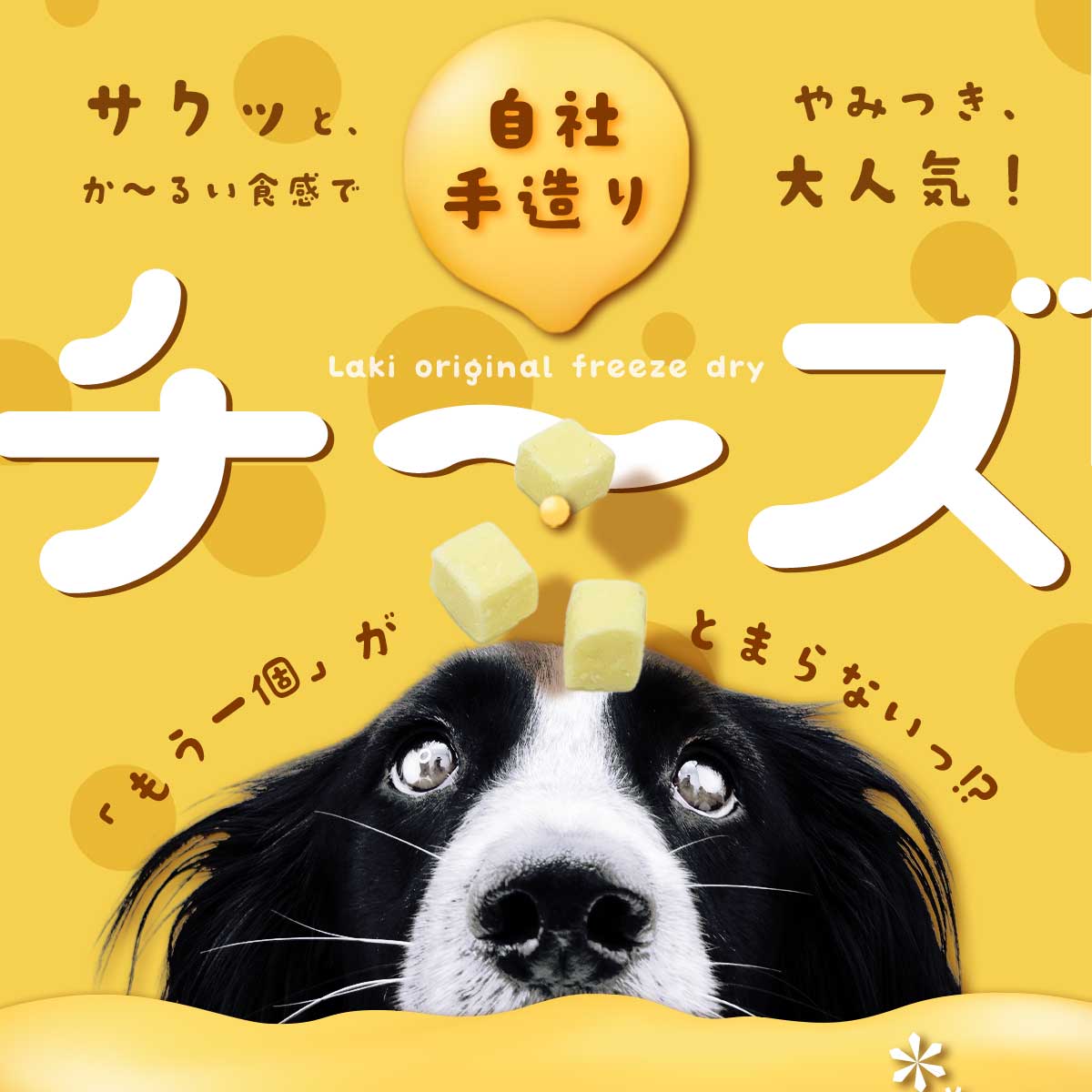 1日の給与量 体重 与える目安 ~ 5kg ~5個 ~10kg ~9個 ~20kg ~15個 20kg~ ~20個 ※1日に必要なエネルギー量の20%以下となるよう上記の給与量を目安に2〜3回に分けて与えてください。 ※おやつは嗜好品です。フードの量に合わせて与える量を調整してください。 商品説明 さくさく食感が癖になる!シニアにもおすすめ ◆軽くてさくさく!フリーズドライ製法を採用しました。硬いものが苦手なペットやシニアペットにも優しい食感に仕上げています。 水を加えることで、まるで新鮮な原料そのもののような美味しさが戻り、幅広い年齢層のペットたちに楽しんでいただけるスナックです。 ◆瞬間冷凍技術を駆使して栄養素をほとんど壊さずに加工を実現しました。 通常の加工では栄養素が変化・破壊されることが多いですが、瞬間冷凍することで新鮮なままの栄養素を保つことができます。 ペットにとっても、飼い主にとっても安心の高品質スナックです。 ◆チーズは香りが強いのでワンちゃんの気を引きやすい食べ物。集中力アップや食欲アップにも繋がります。 油分が少ないためさらさらしていてべたつかず持ち運びしやすい、約0.8cmサイズの小粒キューブタイプ! お散歩中のご褒美にもぴったりです。 ◆水分量を2%代まで下げることに成功!限りなく水分を少なくすることで劣化を防ぎ、新鮮な状態で長期保存が可能に。 名称 フリーズドライチーズキューブ 原材料名 プロセスチーズ 内容量 35g 成分分析値 たんぱく質:37.0%以上 脂肪分:48.5%以上 繊維:0.1%未満 灰分:8.2%以下 水分:2.1%以下 エネルギー:556kcal 賞味期限 製造日から1年間 保存方法 直射日光・高温多湿を避け冷暗所にて保管 配送方法 メール便 製造者 株式会社LAKI大阪府堺市堺区南花田口町1丁目1-12 原産国 日本産