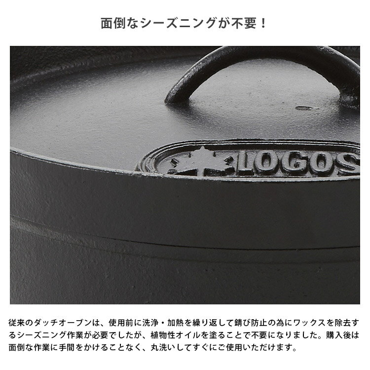 LOGOS #81062229 SLダッチオーブン10inch・ディープ(バッグ付き) シーズニングいらず!いろいろ使える10インチ 従来は使用前に洗浄・加熱を繰り返して錆び防止の為にワックスを除去するシーズニング作業が必要でしたが、 植物性オイルを塗ることで不要になりました。 購入後は面倒な作業に手間をかけることなく、丸洗いしてすぐにご使用いただけます。 家庭用コンロでも使えるIH対応構造 アウトドアでも家庭でも使いやすい脚無しの鍋底にしました。家庭用ガスコンロやIHクッキングヒーターでご使用いただけます。 運搬や収納に便利な専用キャリーバッグ付き 特性上重量のあるダッチオーブンを持ち運びしやすくする専用キャリーバッグを付属しました。 ポリエステル素材で丈夫で油染みしにくく、まわりの物を汚さず収納することができます。 さらに広がる使い方 別売りのピラミッドTAKIBIシリーズと組み合わせると、直火禁止のキャンプ場でも本格的な焚き火調理がお楽しみいただけます。 ※製品は予告なく仕様を変更する場合があります。 ※写真は実際の形状、サイズ、色味と異なる場合があります。 概要 総重量 約 5.5kg サイズ 約 口内径23.7×深さ10.5×外形幅28.5cm 容量 約 4.0L 収納サイズ 約 直径30.5×高さ17.5cm 構成 本体、収納バッグ 主素材 鋳鉄、ポリエステル 性能/特長 ・シーズニングレス仕様だから、面倒なシーズニングが不要 ・料理の幅が広がる深型 ・キッチンでも使える脚無しタイプ ・IH対応 ・収納バッグ付き