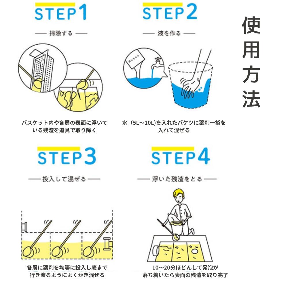 ※日本郵便クリックポストにてお届けしますので、郵便局にて居住の確認ができない場合配達が出来ません。 ご転居をされた場合は、郵便局にて転居届をご提出の上ご注文ください。 また、ホテルやマンスリーマンション等居住の確認ができない場所への配達も致しかねます。 ※ポストに入らないかつご不在時は不在票が入りますので、最寄りの郵便局へ再配達のお手配をお願いいたします。 「再配達依頼をしない限り配達されませんので」、ご注意ください。 保管期限(約7日)を過ぎますと、当店へ返送となります。 沖縄生まれ。 環境に優しい強力グリストラップ洗浄剤です。 グリストラップ容量100L以内に対して1回洗剤450g(1袋) 検索キーワード:配管用洗剤 悪臭除去 油処理 たんぱく質 排水溝 パイプつまり 商品スペック 商品名 美ら技研株式会社 美らちゅら超洗浄(グリストラップ用) 内容量 450g 使用方法 グリストラップ容量100L以内に対して1回洗剤450g(1袋) 【STEP1】 ・バケツに水(5~10L)に洗剤1袋を投入してよくかき混ぜ溶かす。 ・持続力を保つため、洗剤は溶けにくくなっております。全部溶かす必要はございません。 【STEP2】 ・グリストラップ内のゴミカゴを取り出し、カゴ内のゴミを取り除く。 ・溶かした洗剤(5~10L)をグリストラップ全体に行き渡るようにバランスよく投入する。 【STEP3】 ・洗剤が底まで行き渡るようにまんべんなくかき混ぜる。(5分~10分) ※バケツ底に洗剤が残るので再度お水を入れてかき混ぜ、グリストラップ内に投入する。 バケツ内の洗剤が無くなるまで繰り返す。すべての洗剤を投入後、まんべんなくよくかき混ぜる。 【POINT】水を流しながらかき混ぜると、より効率的で作業もスムーズに行えます。 ・表面に泡(2~3cm)が出たら完了です。泡立ちが悪いと感じた場合は、水(10~20L)をグリストラップ内に投入し再度かき混ぜてください。 【STEP2】で取り出したゴミカゴを元に戻す。 【STEP4】 ・10分~20分で発泡が落ち着きます。 ・表面に浮いてきた残渣をできるだけ綺麗に取り除く。 【STEP5】※初めて使用する場合のみ ・グリストラップにバケツ3~5杯(20L~30L)の水を入れてよくかき混ぜる。 ・もう一度【STEP1】~【STEP4】を実施する。 →普段通りご使用を再開してください。 ※肌が弱い方や刺激を感じる方は、念の為ゴム手袋を着用ください。 ※2回目の使用からはら、【STEP1】~【STEP4】の方法で使用してください。 ★清潔を保つため、1ヶ月に2回~4回の使用をオススメいたします。 ※製品の特性上、袋が膨張しないよう袋上部にの小さな穴をあけておりますが、 品質や安全性には問題ございませんのでご安心ください。 ※火気、熱(機械室・ボイラー室等)直射日光を避けた湿気の少ない涼しい場所に保管してください。 ※他の塩素系洗剤、次亜塩素酸ソーダ、次亜塩素酸ナトリウムとの直接混合使用は絶対にお避け下さい。 ※作業動画について:動画上では旧商品を使用しているため1袋500gと記載がございますが、商品リニューアルにつき成分が濃縮され500gから450gに仕様変更しております。効果は同等となります。 成分 主成分:重炭酸ナトリウム他・界面活性剤 広告免責 株式会社WISNISTA 注意事項 ※メーカー希望価格はメーカーサイトに基づいて掲載しております。 ※予告なくパッケージデザイン等が変更になるとこがございます。他社製品との比較 項目 美らちゅら超洗浄 酵素系洗剤 強アルカリ系洗剤 薬剤の性質 弱アルカリ性(酸素系) 弱アルカリ性 強アルカリ性 油分解の方法 油分を浮かし細かい粒子にさせ水溶性物質へ 油分を浮かし細かい粒子にさせ水溶性物質へ 乳化 臭い抑制効果 抑制効果あり即効性あり持続性あり 抑制効果あり 即効性なし 持続性あり 抑制効果あり(種類によっては臭い残りあり) 即効性あり 人体への影響 少ない 少ない(肌の弱い人には炎症の可能性あり) 劇薬グローブ・マスク必須 作業方法 水に溶かして 15分程度の攪拌作業 従業員でも可能 ぬるま湯に溶かして 半日程度の攪拌作業 攪拌方法によっては効果が出ない場合あり まぜるのみ 従業員でも可能 劇薬物のため取扱注意