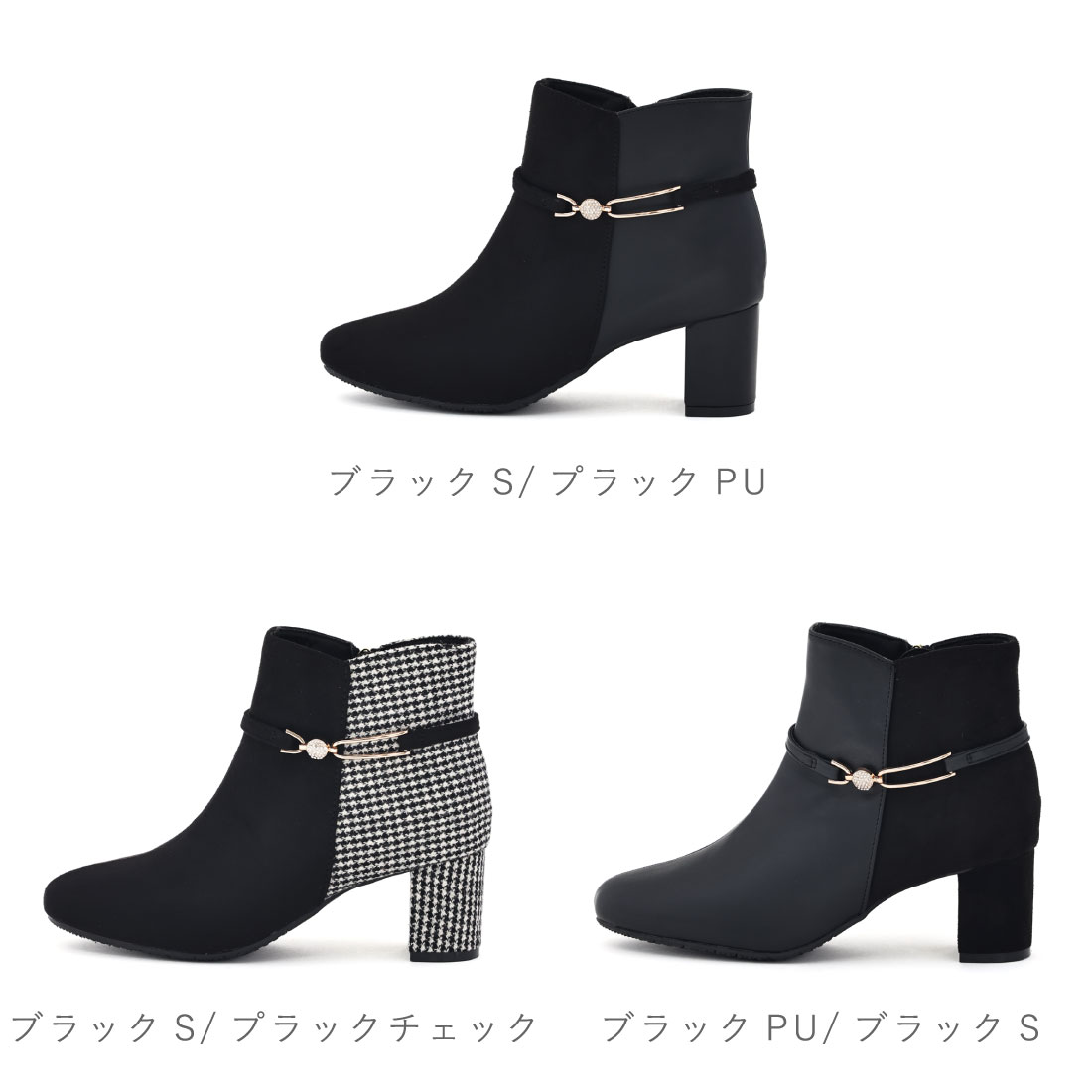 レディース ブーツ スクエアトゥ バイカラーショートブーツ 太ヒール チャンキーヒール サイドファスナー デザインノート Design Note 防滑 ビジュー シンプル きれいめ 6cmヒール 9024