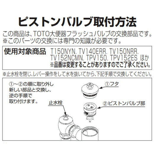 ※こちらのパーツ交換はプロの方に依頼してください。 TOTO トイレ補修パーツ ピストンバルブ部(T150N型用) THY320 TOTO大便器フラッシュバルブの交換部品です。 【使用対象商品】T150NYN,TV140ERR,TV150NRR,TV152NCMN,TPV150,TPV152ES,ほか ※品番は変更することがありますのでご了承ください。 発売元:TOTO株式会社 *対応品番でご不明な場合は、TOTOお客様フリーダイヤル/0120-03-1010までお問い合わせください。※お使いの便器およびタンクの品番を必ず確認して下さい。 ※メーカーオプション品のため、ご注文後の商品手配となります。ご注文後のキャンセルはご遠慮下さい。