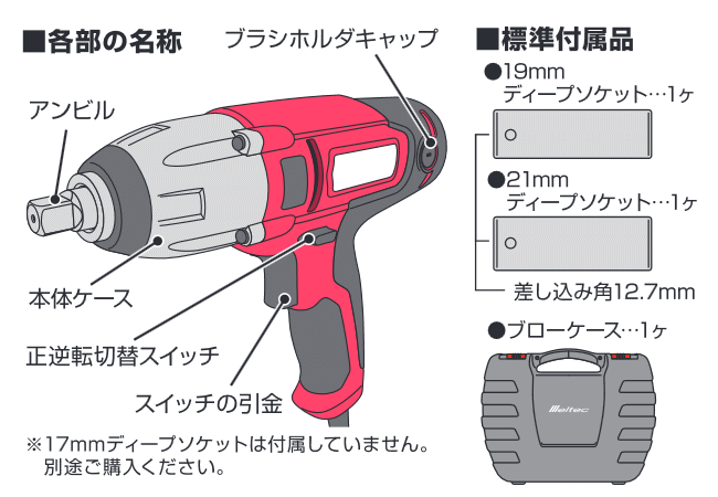 仕様 入力電圧:AC100V 使用電流:単相交流 50/60Hz 締付トルク :250N・m 締付時間2秒(継ぎコードなしの場合) 能力:ボルトサイズM10〜M14(普通ボルト) アンビル部寸法 :12.7mm(ソケット取付部の四角の対辺寸法) 電流 :3.5A 消費電力:定格350W 回転数:0〜2900min-1 打撃数:0〜3100min-1 付属品:ディープソケット(19mm・21mm)、交換用カーボンブラシ2個 電源コードの長さ:約2.1m 本体サイズ :約80(W)×205(H)×290(D)mm 重量:約2.1kg(コード・ソケット除く) 商品説明 モーターの力でらくらくナットがゆるむ・締まる。 ※品質向上のため予告なく仕様を変更する場合がございます。パッケージのリニューアル等につき、商品画像が異なる場合がございます。商品画像の色合いは、画像処理上、若干異なる場合がございます。