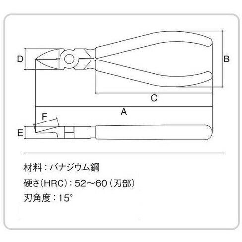 仕様呼び寸法:190mm、重量:220g、全長:197mm、幅:49mm硬さ:52~60HRC(刃部)刃面形状:R型(曲面)プラスチック専用 用途プラモデルの製作・一般プラスチック成形品のゲートの切断 切断能力樹脂8.0mm※切断能力は刃の中心部での能力となります。 材質/材料バナジウム鋼 柄部:ビニールグリップ ●手作業で仕上げた鋭利な刃が、素晴らしい切れ味と使い心地をお約束します。 ●連続作業が楽なコイルバネ。 ●くい違い防止ストッパー付(刃奥部) ●金属切断不可 ※プラスチック以外や、切断能力以上のプラスチックは切断しないでください。 ※太い線材は刃の中心より根元部で、やわらかく細い線材は刃先で切断してください。 ※警告)グリップは絶縁体ではありません。電源を切ってご使用ください。 ※品質向上のため予告なく仕様を変更する場合がございます。 ※パッケージのリニューアル等につき、商品画像が異なる場合がございます。予めご了承ください。 ※商品画像の色合いは、画像処理上、若干異なる場合がございます。予めご了承ください。