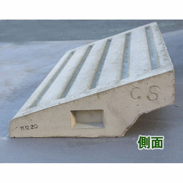 仕様 材質:コンクリート (鉄筋有り) サイズ:600×300×高さ120mm/1個 重量:26kg/1個 商品説明 コンクリート製の重くて頑丈なスロープです。車や自転車、歩行時の段差解消に。 最も高い部分で約12cmの高さです。背面の底部には道路脇などの排水を妨げないように空間が確保されています。 スロープの角度がフラットなためスムーズな乗り上がりです。 ※注意:ご使用環境によって白華現象(カルシウム分が浮き出す白い跡)が起きる場合がございます。これはレンガやコンクリート製品で一般的に起きる現象ですのであらかじめご了承ください。 ※注意:多少の角欠けが通常出荷品に含まれます。 ※注意:屋外管理品のため、お届け時に雨による濡れや砂汚れなどがございますのでご了承ください。 ※注意:車に使用する場合は下地のしっかりした場所でご利用ください。不安定な場所に設置して車で乗り上げた場合、破損する場合がございます。 ※品質向上のため予告なく仕様を変更する場合がございます。パッケージのリニューアル等につき、商品画像が異なる場合がございます。商品画像の色合いは、画像処理上、若干異なる場合がございます。直送商品代引き不可時間指定不可北海道配送不可