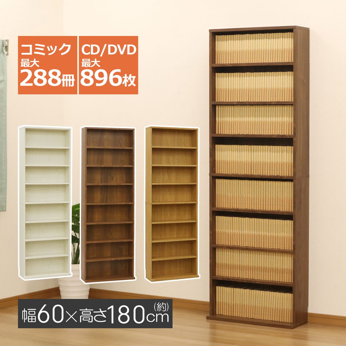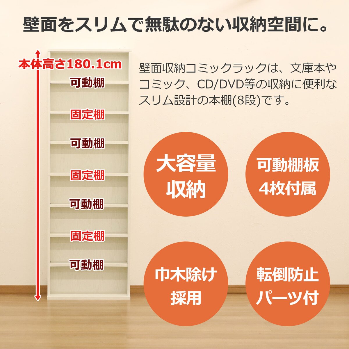 仕様 カラー:ナチュラル 棚板厚み(約):1.8cm 棚板調整ピッチ(約):1.6cm 巾木避け対応サイズ:厚み1cm、高さ9cmまで 収納可能目安数(約):少年コミック(新書版)/約224~288冊、CDケース/約448~896枚、DVDケース/約288~896枚 耐荷重(約):10kg/棚板1枚 材質:プリント紙化粧繊維板 お客様組立品 製品サイズ(mm) 幅×奥行×高さ:600×220×1801 製品重量(g) 17500 商品説明 文庫本やコミック、CD/DVDの収納に便利な、大容量壁面収納ラックです。 大量のコミックや本がスッキリ片付く壁面収納のラック。 奥行が浅く、お部屋に圧迫感を与えません。 棚板は固定棚3枚、可動棚4枚の計7枚。可動棚は収納物に合わせて高さ調節できます。 棚板は厚み1.8cmとしっかりした造りで、耐荷重10kgまで収納可能。 背面下に巾木避けがあるため、壁面にぴったり設置が可能。 簡易転倒防止パーツ付きで安心です。 横揺れを軽減し強度を高める背板留め付き。 ※品質向上のため予告なく仕様を変更する場合がございます。パッケージのリニューアル等につき、商品画像が異なる場合がございます。商品画像の色合いは、画像処理上、若干異なる場合がございます。直送商品代引き不可時間指定不可