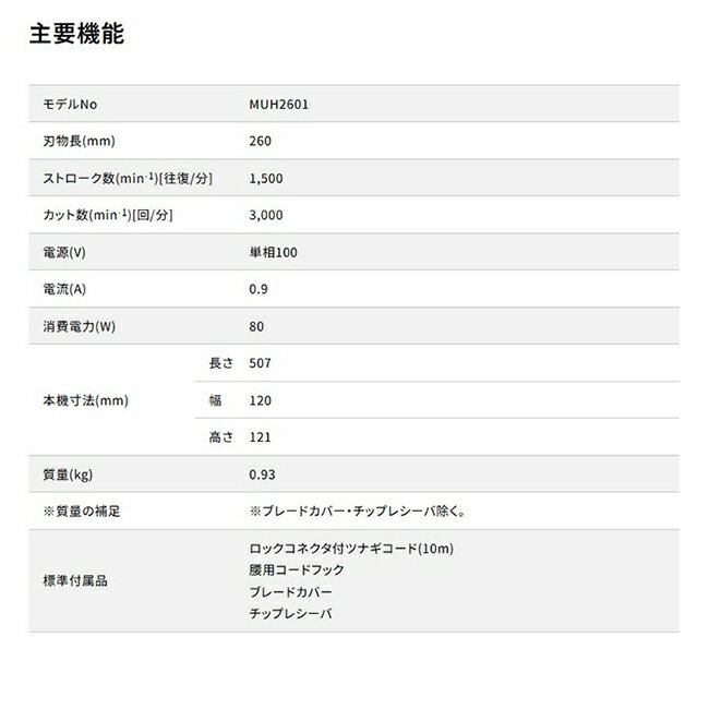 仕様 上下刃駆動式・ソフトグリップ・左右両側ロックオフボタン・ロックコネクタ付ツナギコード10m付・腰用コードフック付 商品説明 静かな動作音。 枝葉の収集量約1.3倍、新・チップレシーバー。 特殊コーティング刃仕様。 通電ランプ付。 ※品質向上のため予告なく仕様を変更する場合がございます。パッケージのリニューアル等につき、商品画像が異なる場合がございます。商品画像の色合いは、画像処理上、若干異なる場合がございます。