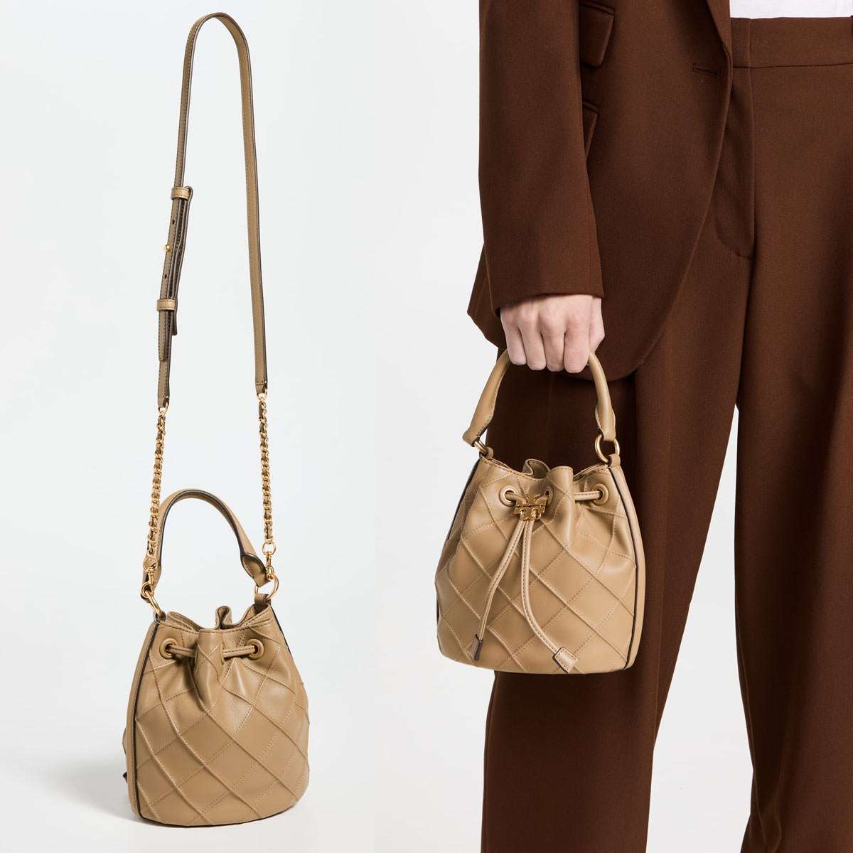 Tory Burch トリーバーチスモール フレミング ソフト バケットバッグ 世界中のセレブに根強いファンをもつトリーバーチはさりげないラグジュアリーを提案するライフスタイルブランドです。柔らかなレザーにダイヤ柄のピンタックを施したバッグです。ダブルTコードストッパーは、ドローストリングのキーパーとして機能します。レザーのトップハンドル、またはチェーン付きのクロスボディストラップで持ち運ぶことができます。● 商品名スモール フレミング ソフト バケットバッグSMALL FLEMING SOFT BUCKET BAG● カラーPebblestone● サイズ・高さ(約)17.5cm x 横(約)15.5cm x 幅(約)9.5cm・トップハンドル(約)12cm、調節・取り外し可能クロスボディストラップ(約)56cm● 素材Leather ●商品詳細 ・ドローストリングクロージャー・チェーンとレザーを編み込んだショルダーストラップは取り外し可能で、長さ調節可能 ※こちらの商品はアウトレット用商品ではなく、正規販売店用商品です。TORY BURCH の販売実績10年以上!トリーバーチは2004年にNYで創業、弊社バイヤーの提案により販売を開始したのも2004年。当時、日本での知名度はまったくありませんでした。創業当初より、品質の高さとファッション性を兼ね備えた、「上品なラグジュアリー」を提案できるブランドです。偽物・コピー商品にご注意 世界の人気ブランドに成長したトリーバーチですが、残念なことに偽物・コピー商品の生産も盛んです。激安価格や偽公式サイトにはご注意ください。 当店の商品は『 100% 正規品保障! 』です。安心してお買い物をお楽しみください。TORY BURCH (トリーバーチ)⇒ ブランドページはこちらから