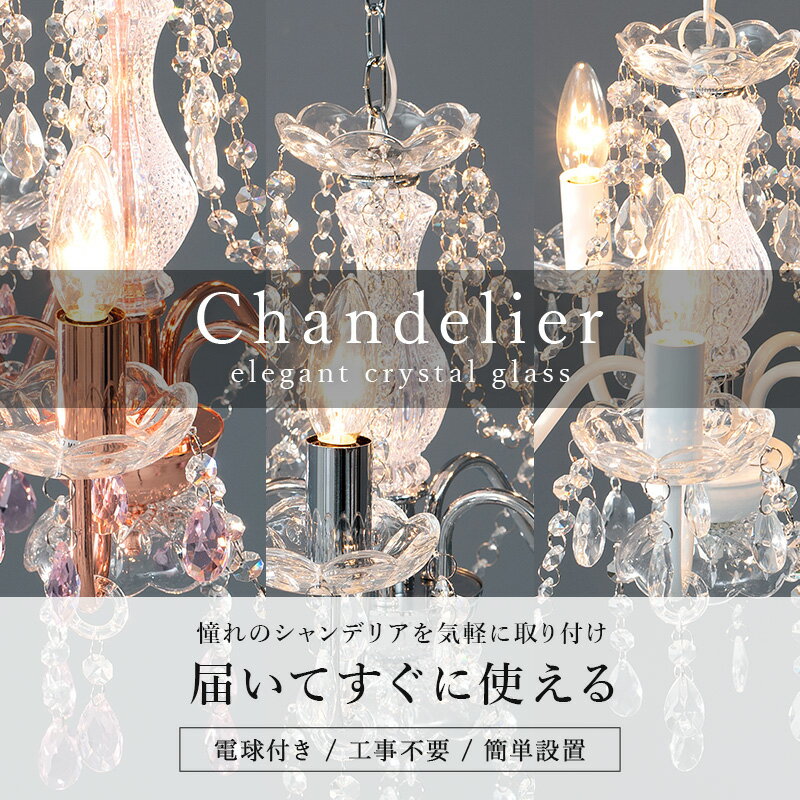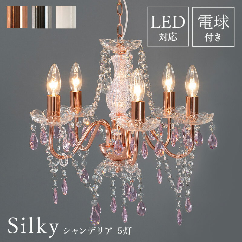 5灯シャンデリア 白熱電球付き(ホワイト/ピンク/シルバー)【Silky】シルキー(シャンデリア おしゃれ LED電球対応 ライト 照明 天井 天井照明 可愛い 工事不要 間接照明 4.5畳 4畳 6畳 シーリング 軽量 簡単 姫系 リビング ダイニング 寝室 一人暮らし エレガント 5灯)