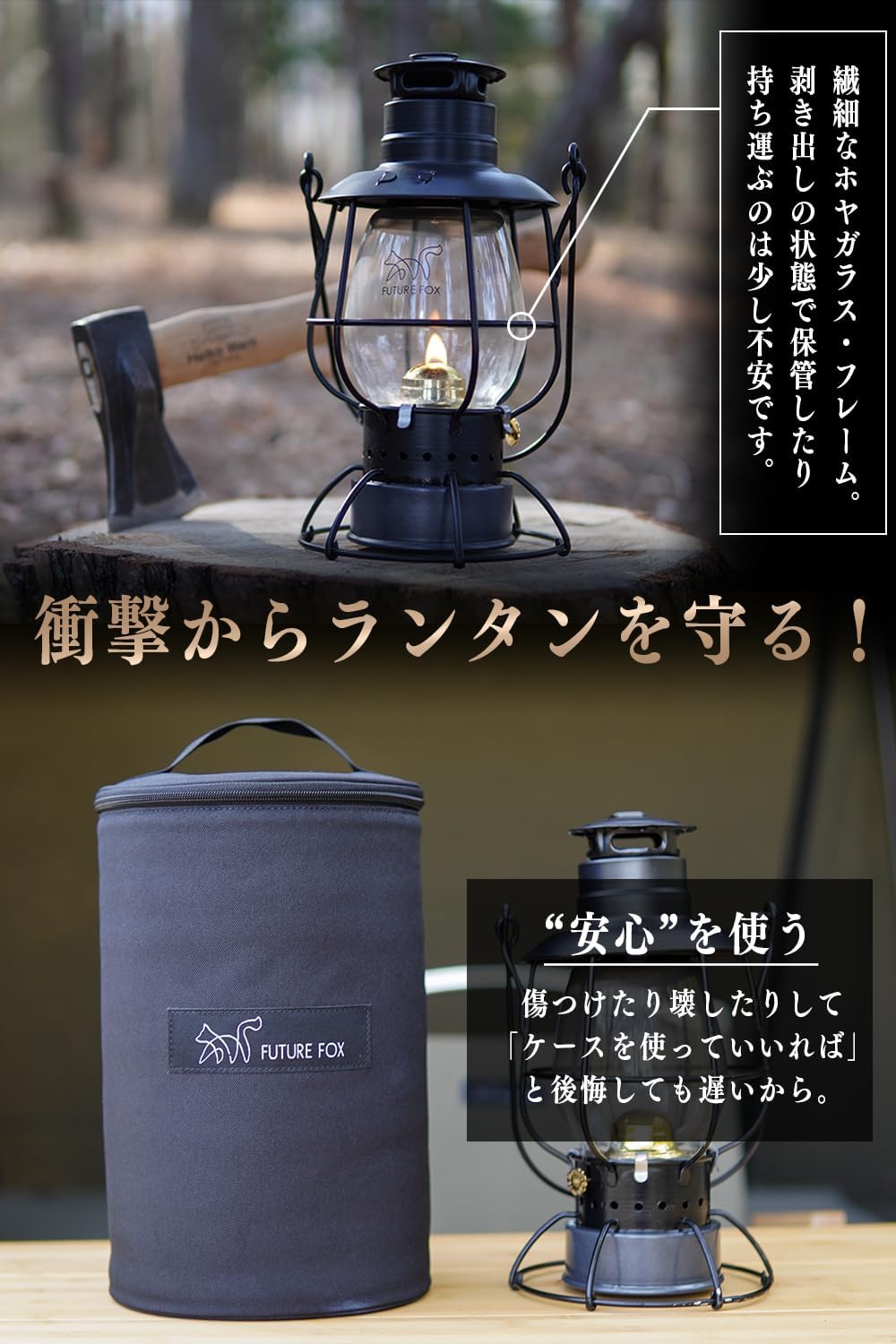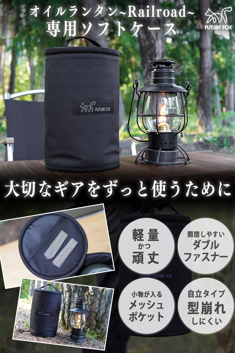 🦊本製品はFUTURE FOX オイルランタン Railroad 専用のソフトケースです。オイルランタン Railroadは別売りとなりますので、予めご了承ください。 🦊オイルランタン Railroadを守るため、持ち運びを便利にするための収納ケースです。生地はオックスフォードを採用し、全面のクッション性の素材を包み込んでいます。そのため、ハードな衝撃にも耐えられるように収納ケースを開発しました。