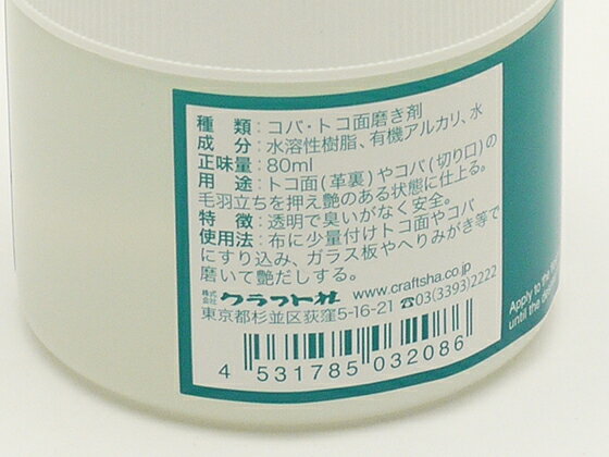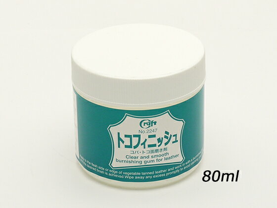 ■型番:C2247■商品名:トコフィニッシュ■販売価格:418円(税込) / 380円(税抜)■メール便について:この商品はメール便には対応しておりません。■発送予定目安:4日以内(日祝日は除く)■サイズ:80ml■商品説明:タンニン鞣し革のコバ・床面の毛羽立ちを押さえ、滑らかで艶やかに仕上げる無色透明の輝き剤です。水性で臭いもなく、安全に使用できます。■使用方法:布や綿棒などでコバまたは床面にすり込み、半乾きの状態でヘリみがきなどを使い擦って磨き上げます。床面の磨きにはガラス板などを利用します。■取扱いメーカー:クラフト社■【注意点】閲覧環境等によって画像の色合いが異なることもあります。◇在庫切れ等によって予定日内に発送できない場合はご連絡させていただきます。