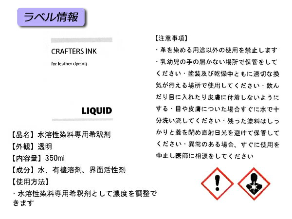 ■型番:PL120■商品名:【Lized】クラフターズインク専用希釈剤リキッド■販売価格:1100円(税込) / 1000円(税抜)■メール便について:この商品はメール便には対応しておりません。■発送予定目安:4日以内(日祝日は除く)■サイズ:350ml■商品説明:クラフターズインク専用の希釈剤です水溶性であるので水での希釈は可能ですが、水を混ぜることで浸透性が低下して色の定着も低下するのを専用希釈剤リキッドでそのような現象を防ぎます希釈剤は濃度を調整する役目と浸透性を調整する=色付きを調整する役目があります*他社の希釈剤を使用した場合は問題が起こる可能性があります■取扱いメーカー:レザークラフトぱれっと■【注意点】閲覧環境等によって画像の色合いが異なることもあります。◇在庫切れ等によって予定日内に発送できない場合はご連絡させていただきます。