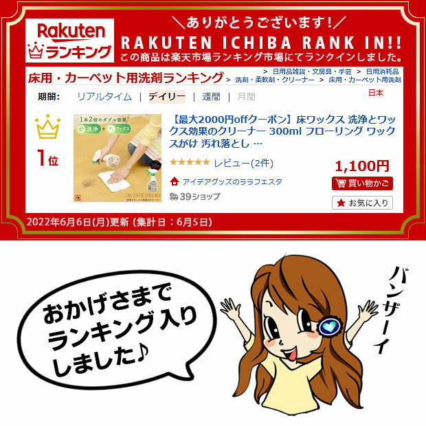 ▼この商品を買った人はこんな商品も買っています924円~1,100円1,100円 【商品名】洗浄とワックス効果のクリーナー 300ml / せんじょうとわっくすこうかのくりーなー 300ml / 掃除 スプレー 【商品説明文】 フローリング・木製家具に。天然素材の蜜ロウ・ホホバオイル・アルカリ電解水だけを使用したワックス効果のあるクリーナー。 1本2役、汚れを落としながらワックス掛け!2度拭き不要。界面活性剤不使用。 1本で約55畳分。 【正味量】 300ml 【成分】 アルカリ電解水、ホホバオイル、蜜蝋 【液性】 弱アルカリ性 【使用量の目安】 1平方メートルあたり2〜3回噴射 【使用頻度の目安】 月1〜2回 【適するもの】 自然塗料、合成樹脂塗料仕上げのフローリング・家具、ビニールクロス等 【適さないもの】 無塗装の木部・皮や紙、土壁等の水拭きができない物・ガラス・鏡面 【原産国】 日本 【使用方法】 噴射口の天面を「▼」に合わせ、汚れている箇所に直接スプレーするか、やわらかい布等に含ませて汚れを拭き取ってください。※広範囲に塗る場合は、水を固く絞った布で広げると、塗り広げやすいです。 使用後は噴射口の天面を「×」に合わせて保管してください。 【使用上の注意】 ●天然素材のため液中に固形物が発生することがある。液が出づらい場合は、トリガーノズルを外し、60〜70℃※のお湯に10分程度浸ける。トリガーを数回プッシュし、噴射されたらよく乾燥させ、再度取り付け、使用する。 ※作業中はやけどしないよう気を付ける。 ●使用後滑りすぎる場合は、ぬるま湯を固く絞ったふきんで拭く。 ●用途以外に使用しない。 ●荒れ性の方や長時間使用する際は、炊事用ゴム手袋を着用する。 ●天然素材のため開封後はなるべく早く使い切る。 ●材質、塗装の種類によっては変色することがあるので、必ず目立たない所で試してから使用する。 ●ガンコな油汚れ、古い汚れ、こびりついた汚れは落ちない。 ●直射日光の当たる場所、高温多湿の場所、子供の手の届く所には保管しない。 ●液が目に入った場合は、こすらず直ちに流水で洗い流し、異常がある時は医師の診断を受ける。 ●万一、飲み込んだ場合は、多量の水、牛乳を飲み、無理に吐かせないで速やかに医師の診断を受ける。 【広告文責】株式会社ル・キュア (075-468-7260) 【下記のギフトにもおすすめ】 母の日 父の日 敬老の日 プレゼント ギフト 母の日ギフト 父の日ギフト 敬老の日ギフト ギフト対応 ギフトラッピング対応 便利グッズ アイデアグッズ ララフェスタ ▼領収書の発行はコチラ▼ ▼こちらも便利ですよ。類似アイテムもチェック!1,540円~1,100円1,760円~1,379円~1,551円1,890円~880円~880円1,000円★注目のNewアイテムはこちら!2025/11/291,628円2025/11/291,628円2025/11/281,628円◆お待たせしました!再販商品はこちら2025/12/11,485円2025/11/304,950円2025/11/291,980円2025/12/01 更新