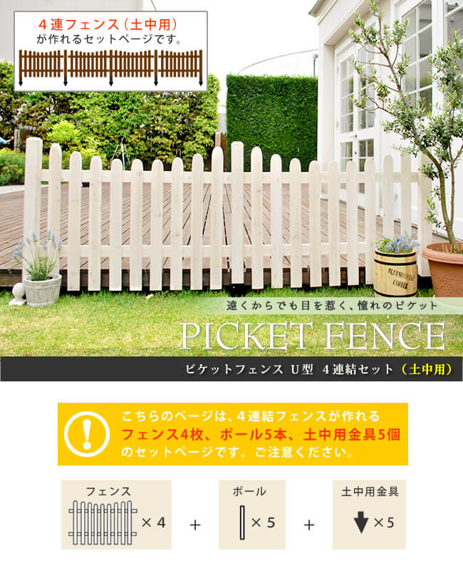 ガーデンフェンス U型フェンス 4連結セット 土中金具 4枚連結セット 120cm幅 ダークブラウン ホワイト 茶色 白 ウッドフェンス 木製フェンス 庭のフェンス ピケットフェンス おすすめ おしゃれ 北欧 庭 ガーデニング 花壇 境界線 目隠し 土中金具セット フェンスセット 4枚組