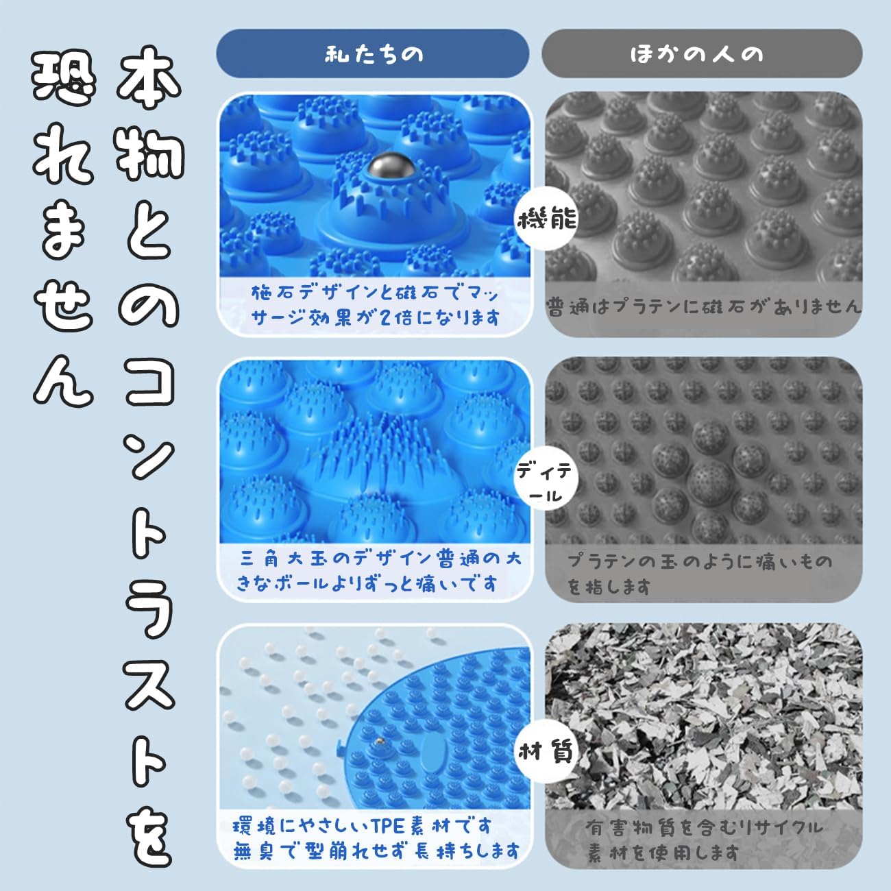 【商品コード】:y813496 【カラー】 ブルー、パープル ブルー37cm、パープル37cm、ブルー41cm、パープル41cm、ブルー43cm、パープル43cm、ブルー55cm、パープル55cm、ブルー58cm、パープル58cm、ブルー61cm、パープル61cm サイズ(直径約):37cm、41cm、43cm、55cm、58cm、61cm 素材:TPE 原産国 : 中国 【この商品について】 足の裏を効果的に刺激することで、血行を改善し、足のむくみや疲れを軽減。1日の終わりに疲れを取るために最適です。 一日30秒から3分くらい乗る事で、筋肉のこりをほぐし、疲れをとります。 自宅やオフィスでの使用に最適なフットマッサージマット。 軽量で持ち運びが簡単なこの指圧マットは、自宅、オフィス、旅行中でも使用でき、どこにいても足のマッサージ療法のメリットを楽しむことができます。 【キーワード】:足つぼ マッサージ 健康 リフレッシュ 疲労回復 リラクゼーション ヘルスケア 自宅ケア 簡単使用 足裏刺激 ストレス解消 自然治癒 日々の癒し リラクゼ 足元ケア 日常健康 気分爽快 足先ケア 無痛快適 美容健康 肌つや改善 エコリラックス 足元暖か 痛気持ち良い 癒しの時間 手軽ケア 足心地 健康トレンド ※簡易包装となりますのでご理解の程よろしくお願いします。 ※手動測定による1・3cmの測定偏差を許容してください。 ※モニターや光の効果が異なるため、実際の色は写真の色と若干異なる場合があります。 ※仕様・デザインは改良のため予告なく変更することがあります。 メーカー希望小売価格はメーカーカタログに基づいて掲載しています