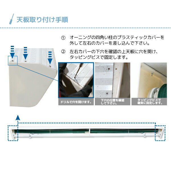 商品説明たくさんのご要望を頂いておりましたオーニングテント専用カバー!大切なテントを保護するとともに外観的にもおさまりが良く映ります。〔組立て手順〕■オーニングのフレームの四角いフレームのプラスティックカバーを外して左右のカバーを差し込みます。■天板には穴が開いてないので左右のカバーに3箇所づつ合計6箇所穴を開けてタッピングビスで固定。■天板固定金具をフレームに固定して天板に穴を開けてボルトで固定。■取り付け方法にご不明な点がございましたらお気軽にご相談ください。・サイト内の動画でも施工方法をご覧いただけます。※youtube にて オーニング施工動画でも検索できます。・こちらの商品は大型サイズ商品となり地域別に別途大型送料がかかります。・離島に関しては配送料が地域により異なりますのでご購入前にお問い合わせください。・配送日・時間帯指定・同梱不可となります。商品内容■ オーニングテント専用カバー 4m/白商品詳細■ 天板/アルミ製 1枚■ 左右のカバー/プラスティック製 1ペア■ 天板固定金具/スチール製 1個■サイズ(約) 3950×190注意事項※当店で販売中のオーニングテントにて取り付けの確認できていますが、 他社・他店にてご購入された商品への取り付けにつきましては未確認となります。※左右のカバーはやや緩く止まる設計になっております。※天板固定金具の組み付け方が悪いとカバー全体が傾くことが有ります。 固定位置を中心に持ってきて、傾くようなら手で曲げて角度を調節してください。※こちらの商品は他の商品とは同梱不可とさせていただきます。※こちらの商品は完全な雨よけ(壁との間)を保証するものではございません。 基本的な役割は収納時のテント生地のヤケ防止となります。保証の有無■保証はございません。■商品初期不良のみ商品到着後7日以内対応させていただきます。■お客様都合での返品は送料、その他手数料をご負担いただきます。