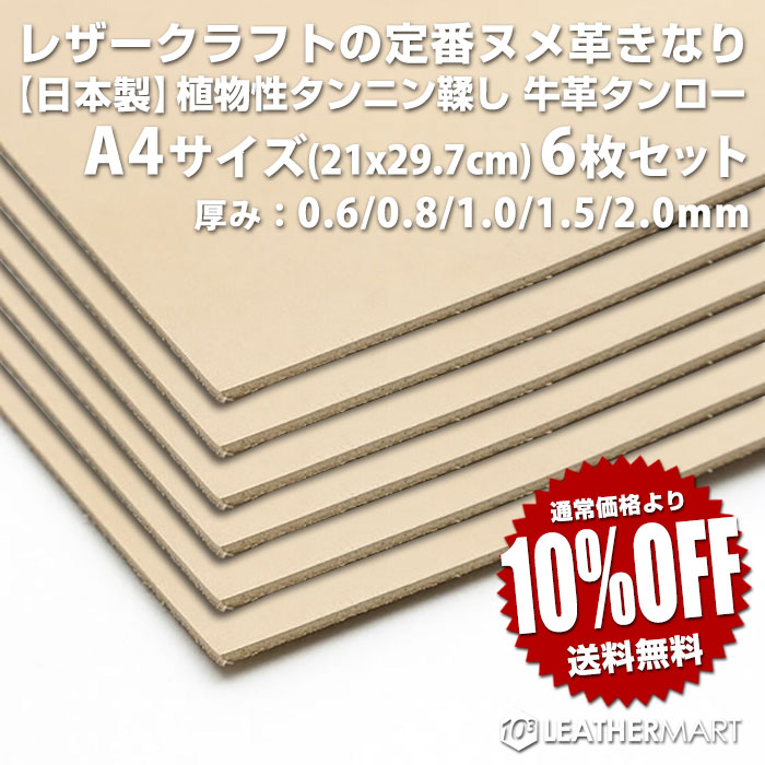 ヌメ革きなり A4サイズ(29.7x21cm)x6枚セット【お買い得セット】【0.6mm/0.8mm/1.0mm/1.5mm/2.0mm】【送料無料】日本製 牛革 タンロー 本革 タンニンなめし 革 皮 生成 天然 無地 レザークラフト 材料 カットレザー はぎれ カービング ハンドメイド 手作り 染色