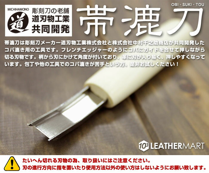 帯漉刀(おびすきとう)サイズ長さ:約147mm幅:約24mm厚み:約16mm刃幅:内/約12mm、外/約14mmセット内容 帯漉刀、空磨ぎ用布ヤスリ#1000、研磨用青棒、無料磨ぎ券付き説明書 商品説明 帯漉刀は彫刻刀メーカー、道刃物工業株式会社と株式会社中村千之助商店が共同開発したコバ漉き用の工具です。 フレンチエッジャーのようにコバにガイドを合せて押しながら切る刃物です。 柄から刃にかけて角度が付いており、革に刃が入り易く、押しやすくなっています。 包丁や他の工具でのコバ漉きが苦手という方、是非お試しください!【注意】たいへん切れる刃物の為、取り扱いにはご注意ください。刃の進行方向に指を置いたり使用方法以外の使い方はしないようにお願い致します。 ◆帯漉刀9mm巾はこちらから