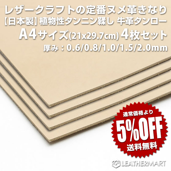 ヌメ革きなり A4サイズ(29.7x21cm)x4枚セット【お買い得セット】【0.6mm/0.8mm/1.0mm/1.5mm/2.0mm】【送料無料】日本製 牛革 タンロー 本革 タンニンなめし レザーマート 革 皮 生成 天然 無地 レザークラフト 材料 カットレザー はぎれ カービング ハンドメイド 手作り