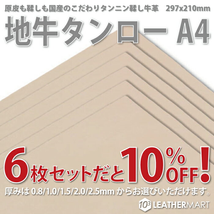【お買い得セット】地牛タンロー A4サイズ(29.7x21cm)×6枚セット【0.8mm/1.0mm/1.5mm/2.0mm/2.5mm】日本製 牛革 ヌメ革 タンロー 本革 タンニンなめし 革 皮 生成 天然 無地 レザークラフト 材料 カットレザー はぎれ ハギレ ハンドメイド 染色 DIY